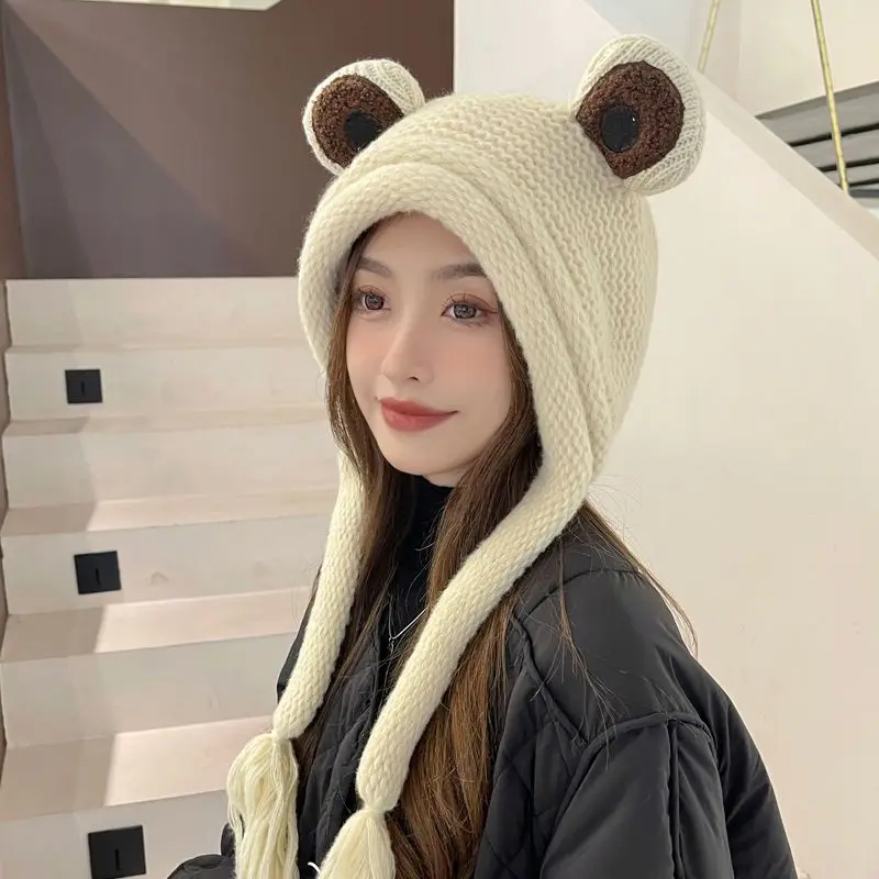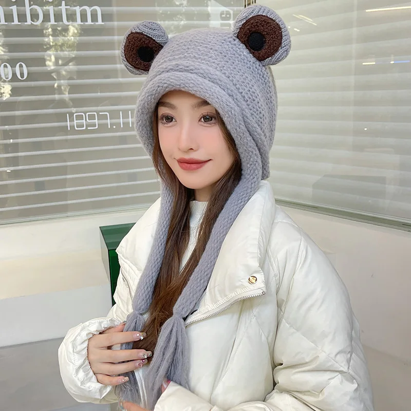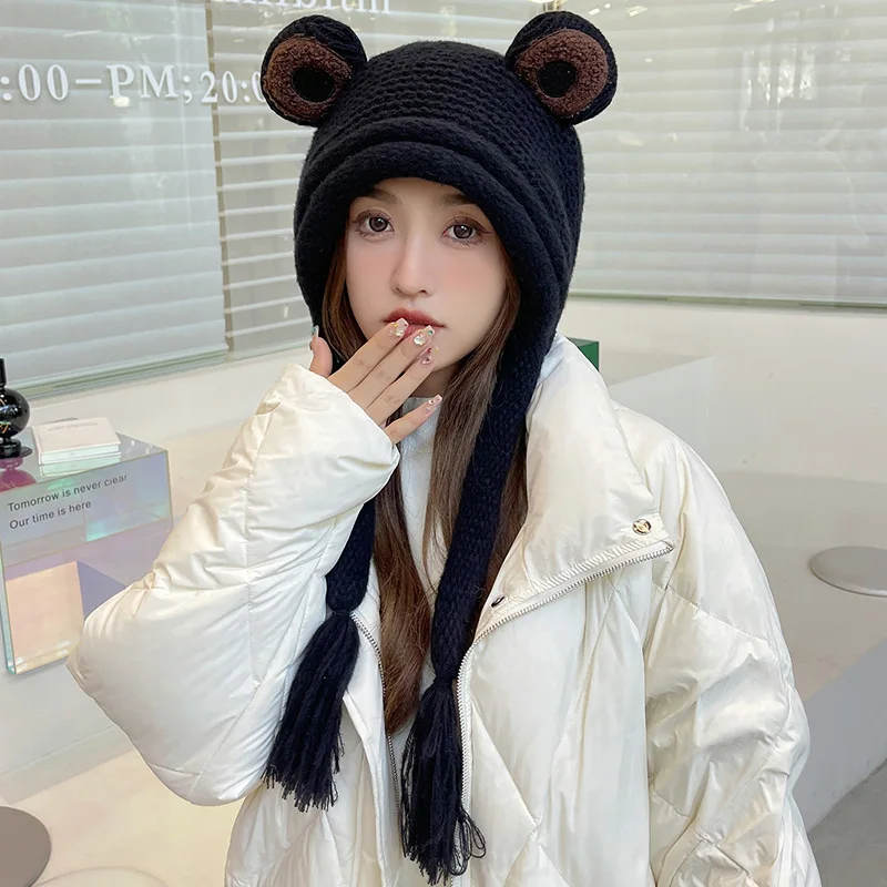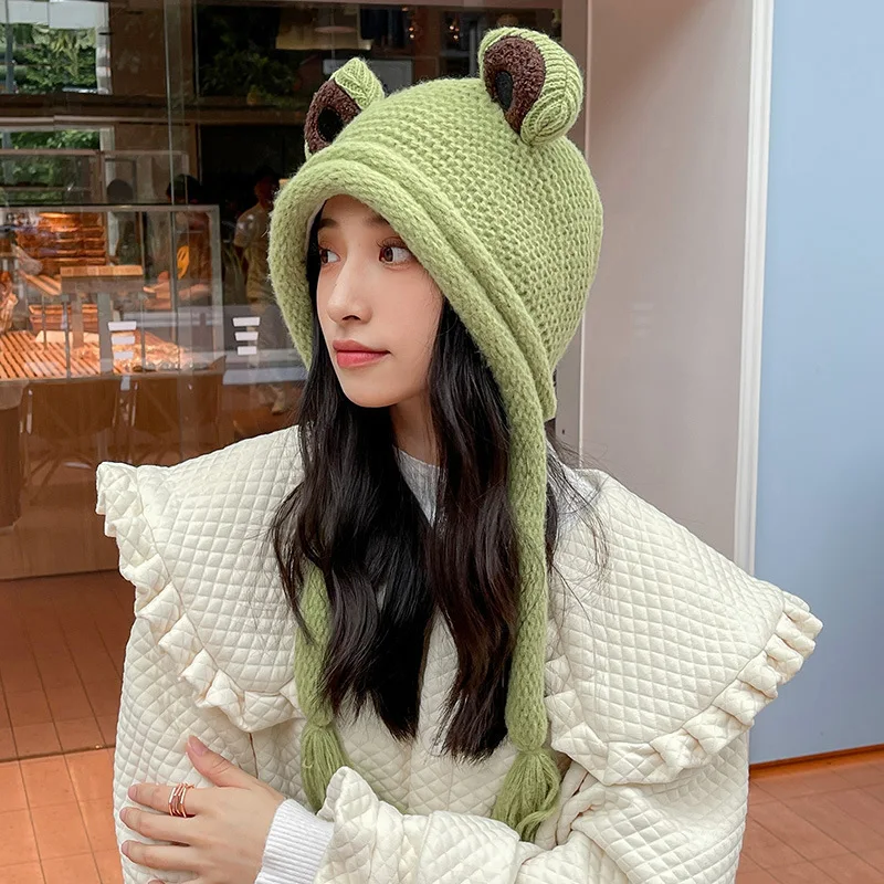 Зимняя модная женская вязаная крючком шапка бини с милыми мультяшными большими глазами лягушками теплые наушники