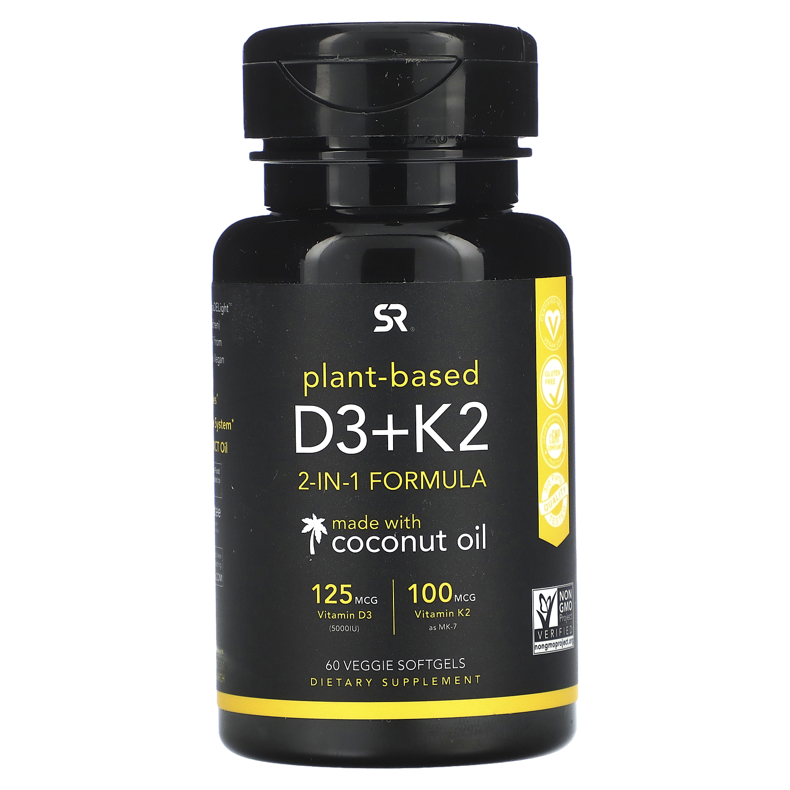 تركيبة 2 في 1يحتوي على زيت جوز الهند125 مكجم فيتامين د3 (5000 وحدة دولية)100 مكجم فيتامين ك2 في صورة ميناكينون-7 مكمل غذائينباتي معتمدخالٍ من الجلوتينمصنوع وفقًا لممارسات التصنيع الجيدة الحالية - ممارسات التصنيع الجيدةمختبر من جهة خارجية مستقلةمعتمد كمنتج خالٍ من المكونات المعدلة وراثيًامكونات نباتيةيجتمع كل من فيتامين د3 وك2 SR™ مع فيتامين د3 النباتي VegaDELight™ (في صورة كوليكالسيفيرول من الليثين) وفيتامين ك2 MenaQ7® (في صورة ميناكينون-7 من الحمص) مع زيت جوز الهند البكر ليكوّنوا معًا PlantGel™