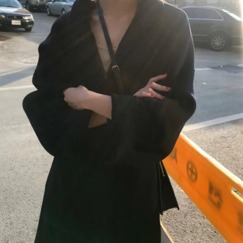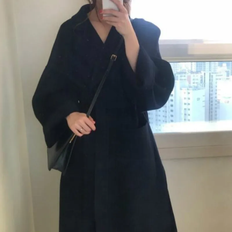 Женское длинное Бандажное шерстяное пальто, Элегантное зимнее пальто, Свободный кардиган, верхняя одежда больших размеров с карманом, отложной воротник