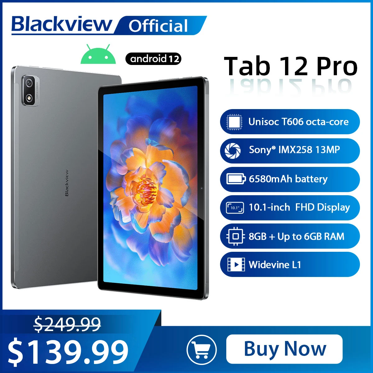 Планшет Blackview Tab 12 Pro, экран 10,1 дюймов, Android 12, Восьмиядерный, 8 ГБ + 6 ГБ ОЗУ 128 ГБ 6580 мАч