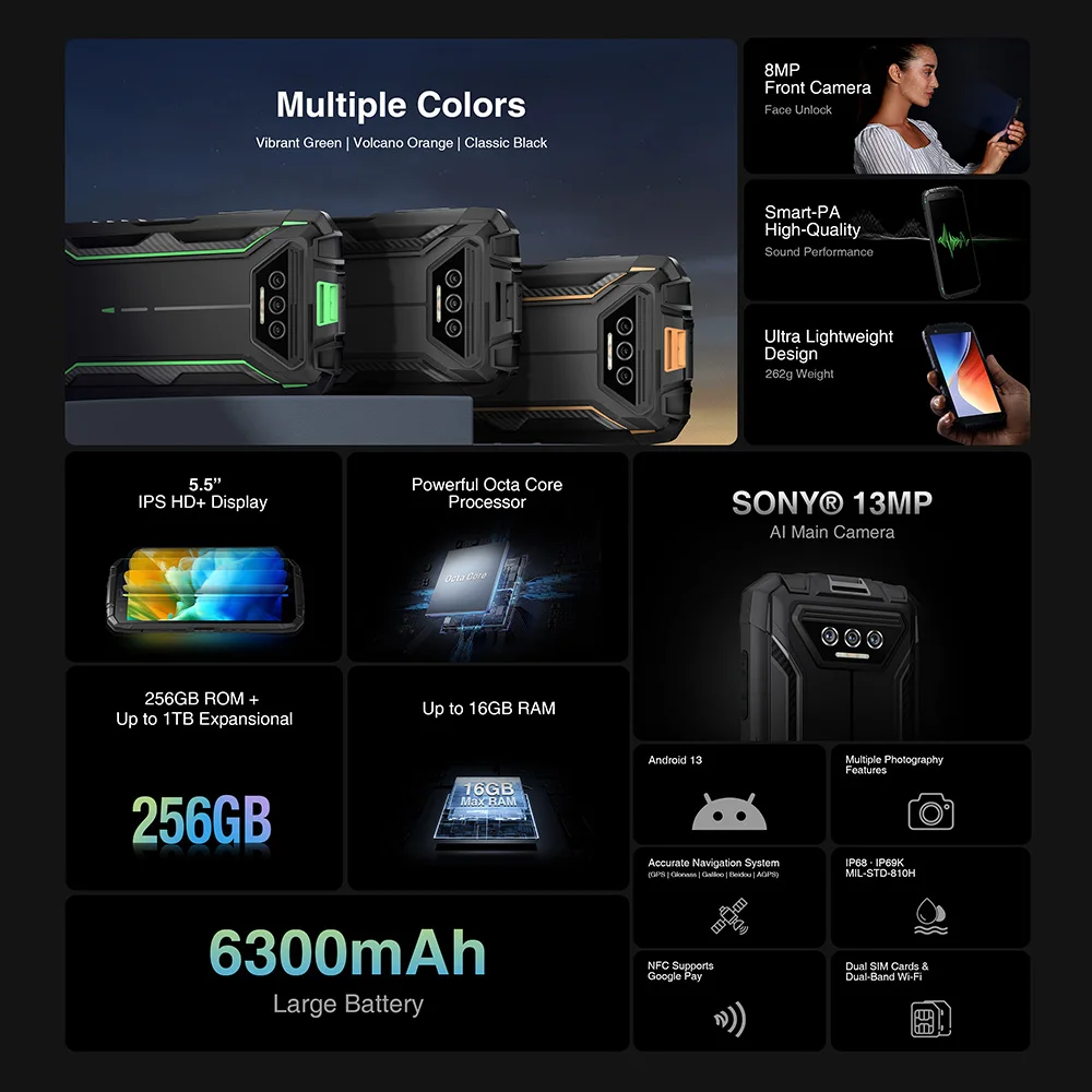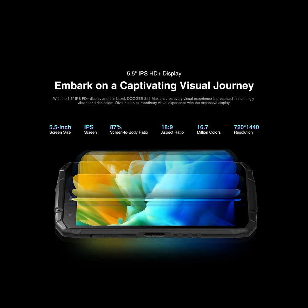Телефон DOOGEE S41 Max защищенный, 5,5 дюйма, IPS HD, 13 МП, ии Тройная камера, 16 ГБ ОЗУ + 256 Гб ПЗУ, четырехъядерный, 6300 мАч, Android 13