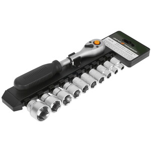 НаборторцевыхголовокДелотехники610711сшестиграннымпрофилемобеспечиваетвысокуюэффективностьработыскрепежнымиэлементами.Дляповышениясцепныххарактеристиквконструкцииголовкииспользуетсярифленаянакатка.Внаборвходят11предметов–10головоксразмеромзахватавпределах7-22ммитрещотка.Разработанныеизхромованадиевойсталипопринципухолодногоштампованиясдополнительнойтермическойобработкой,инструментыДелотехники610711отличаютсяустойчивостьюкмеханическимвоздействиямидлительнымэксплуатационнымресурсом.Специальноепокрытиепредотвращаетпоявлениекоррозии.