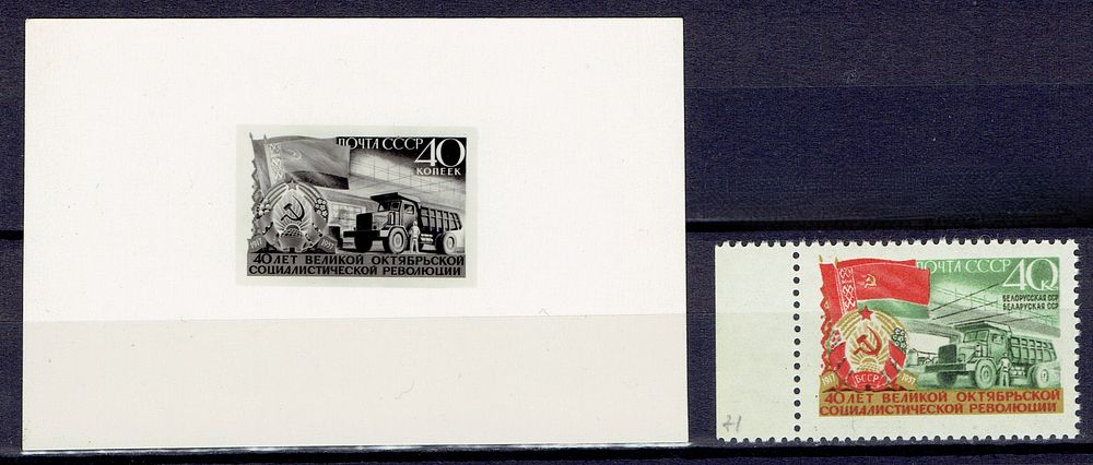 1957 СССР Фотопроба к марке Сол 2079 художника В.В. Пименова, сертификат И.Л. Киржнера. Сол. 2079 СК 1972 - на фотопробе отсутствует текст "Белорусская ССР" под номиналом. Фотопроба выполнена ...
