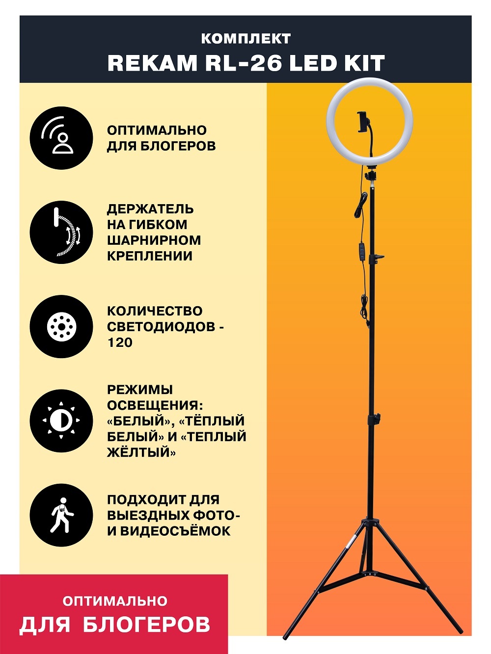 Кольцевая лампа Rekam RL-26 LED Kit. Кольцевой светодиодный (LED) осветитель 26 см, с держателем для смартфона и стойкой до 200 см. – покупайте на OZON по выгодным ценам! Быстрая и бесплатная доставка, большой ассортимент, бонусы, рассрочка и кэшбэк. Распродажи, скидки и акции. Реальные отзывы покупателей. (658288354)