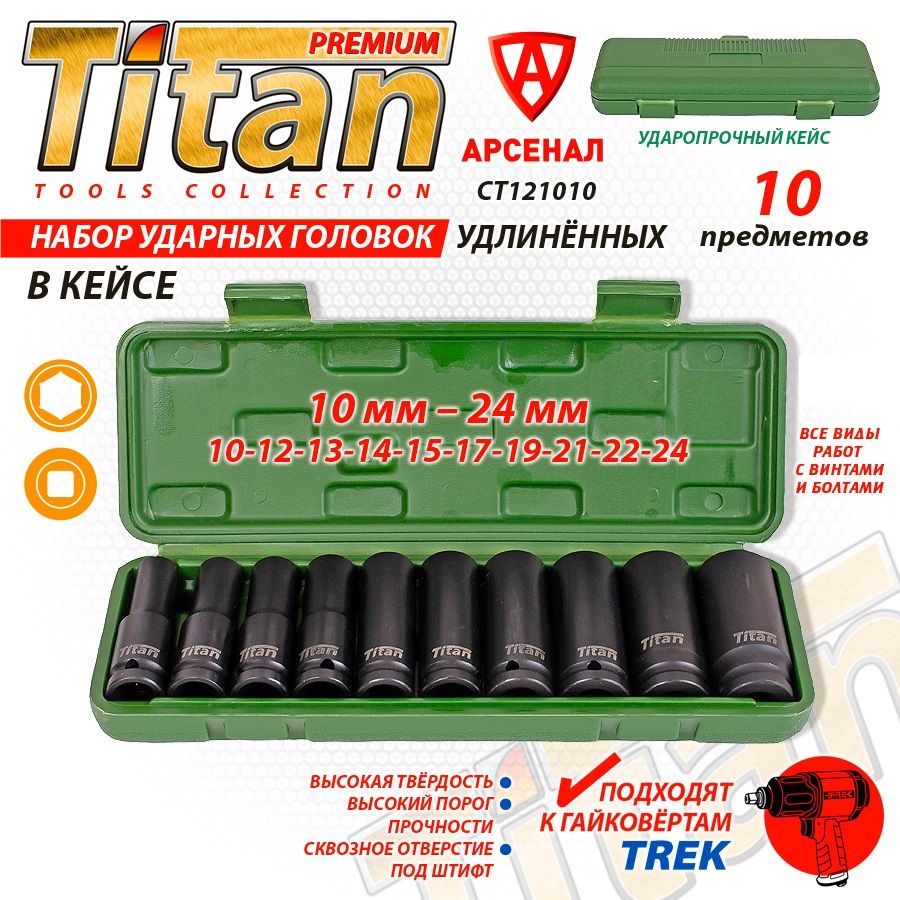 Набор головок ударных удлиненных 1/2"(10-24мм) 10 шт. в кейсе Titan CT121010 – покупайте на OZON по выгодным ценам! Быстрая и бесплатная доставка, большой ассортимент, бонусы, рассрочка и кэшбэк. Распродажи, скидки и акции. Реальные отзывы покупателей. (2673499753)
