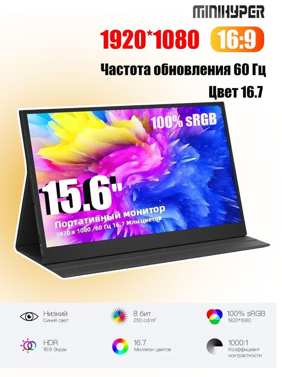 MINIHYPER15.6"МониторMINIHYPER-G156FМультиплатформенныйигровойпортативныймониторс15,6-дюймовымIPS-экраном1920*1080HDRLcd-дисплеемдлякоммутатора,черныйматовый
