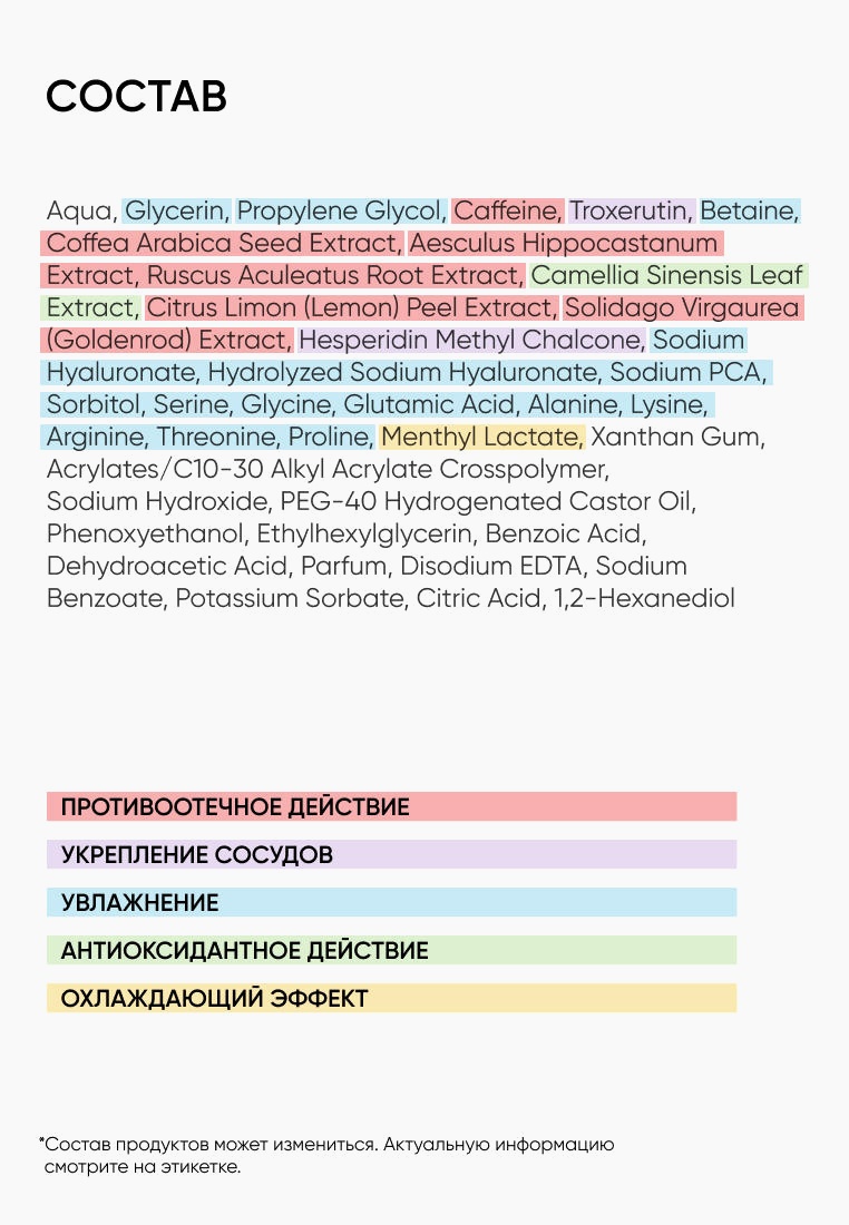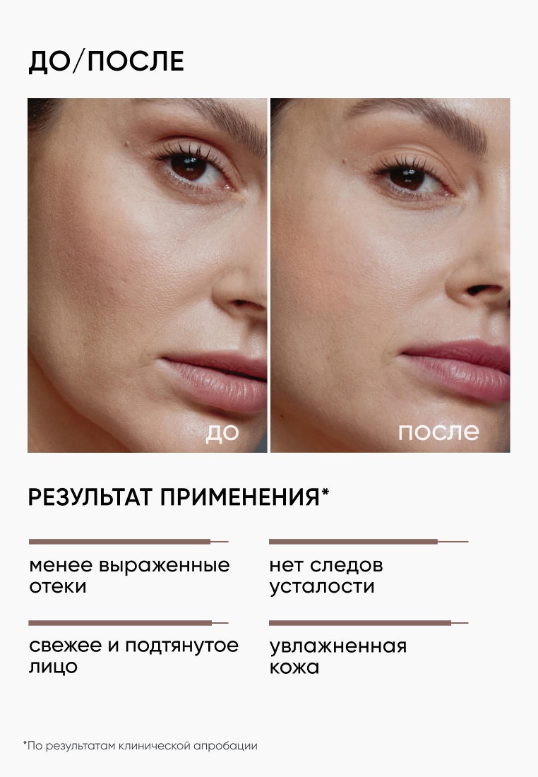"ЛимфодренажнаягелеваямаскаFACESCULPTсклиническидоказаннойэффективностьюуменьшаетотечность,устраняетследыусталости.Увлажняет,придаеткожелицасвежестьиупругость.Результатзаметенужепослепервогоприменения.Гелеваятекстураравномернораспределяетсяпоповерхностикожииобладаетхорошейпроводимостью,поэтомуидеальноподходитдлямикротоковойтерапии,повышающейэффективностьвоздействия.Маскутакжеможноиспользоватьдлямассажа:экспертыICONSKINразработалиспециальнуютехникулимфодренажногомассажа.Маскавыпущенавколлаборациискосметиком-эстетистомибьюти-блогеромКсениейВебер.РЕЗУЛЬТАТ:ощущениеувлажненнойиподтянутойкожи,свежийцветлицабезпризнаковпереутомленияинедостаткасна.ДОКАЗАННАЯЭФФЕКТИВНОСТЬ*:80%Сокращаетотеки75%Освежаеттонкожи,убираетследыусталости95%Увлажняеткожу*%участниковтестирования,подтвердившихрезультат.Потребительскоетестирование,20участников,2недели.Кофеинулучшаетлимфоотток,снимаетприпухлость,укрепляеткожуивосстанавливаетеетонус.Троксерутинповышаетэластичностьсосудов,оказываетвыраженноепротивоотечноедействие.Гиалуроноваякислотаинтенсивноувлажняетиподдерживаетводныйбаланскожи,предотвращаетпотерювлаги.Комплексаминокислотповышаетупругостьиэластичностькожи,защищаетотнегативноговоздействиясвободныхрадикалов.Экстракткамелиистимулируетантиоксидантныепроцессывкоже.Ментиллактатохлаждает,надолгооставляетощущениесвежести.РЕКОМЕНДОВАНАдлявсехтиповкожи,особенновкачествеэкспресс-уходадляустраненияотеков,припухлостиидругихпризнаковусталости."