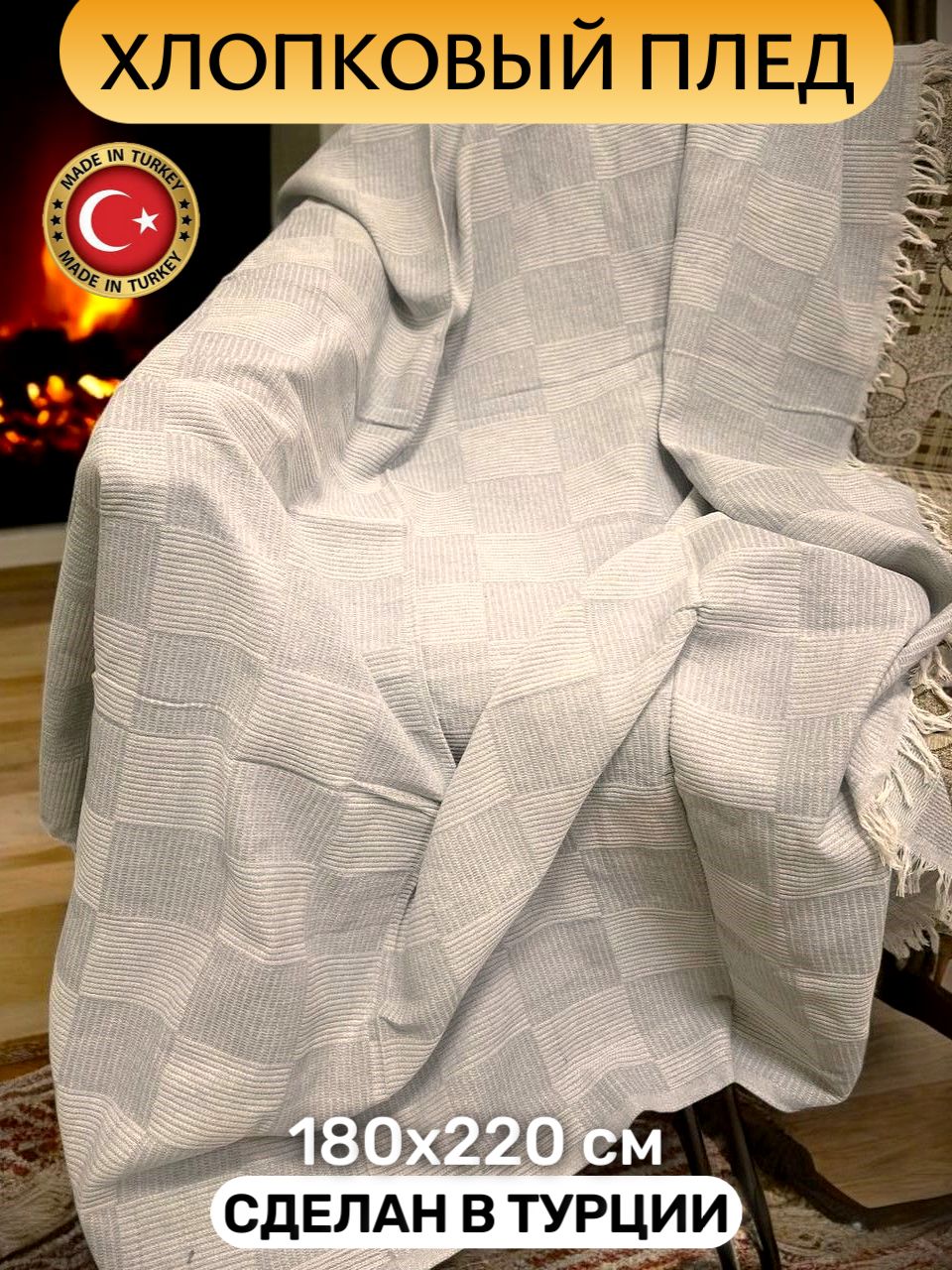 Пледхлопок"Летнийкубик"бежевый180х220см,новогоднийпледнадиваникроватьEvrokomfort