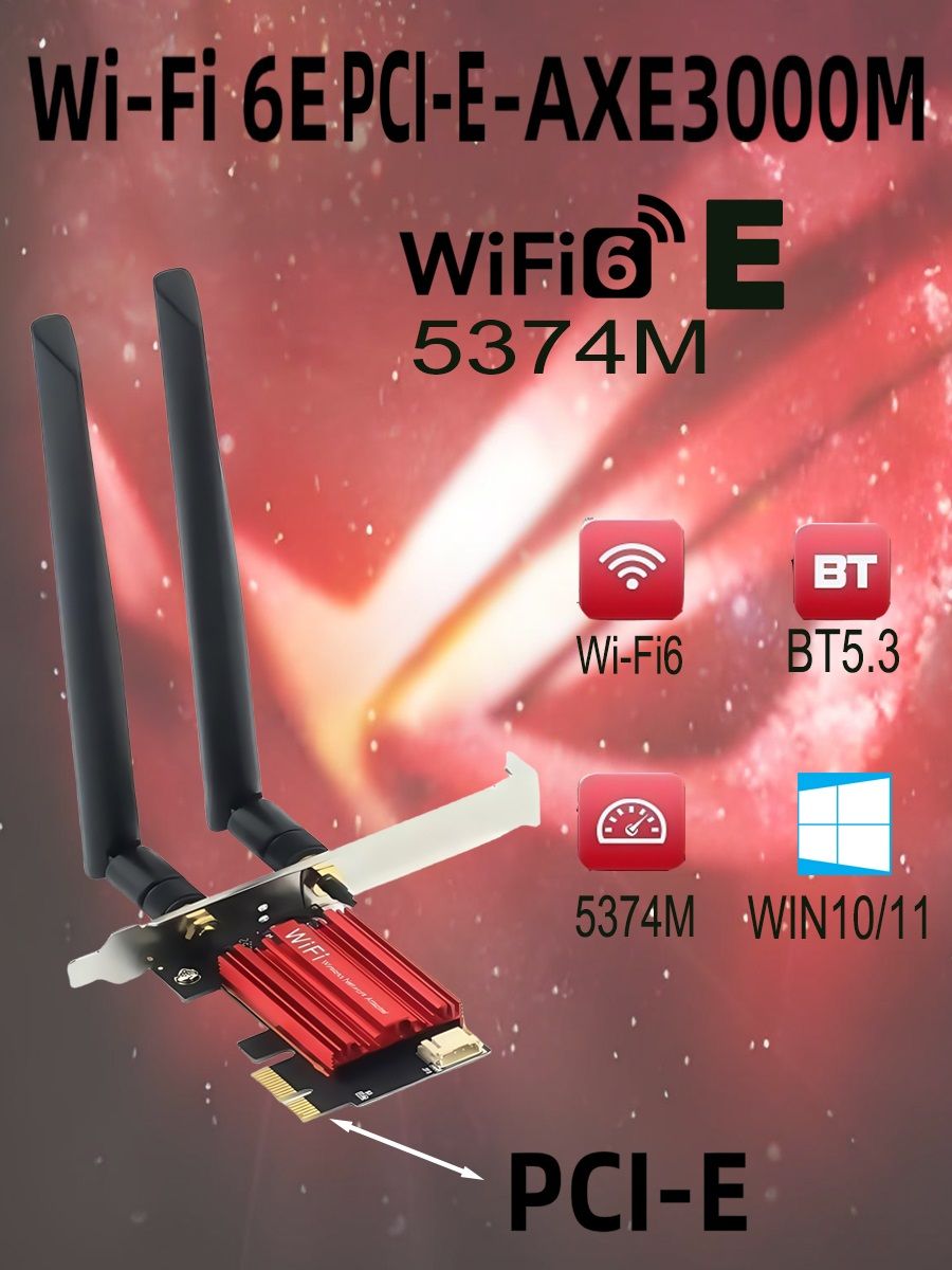 WiFiадаптер(5374Мбит/с)WiFi6ETri-Band2.4/5/6ГГцBluetooth5.3PCI-EДляПКWindows10/11