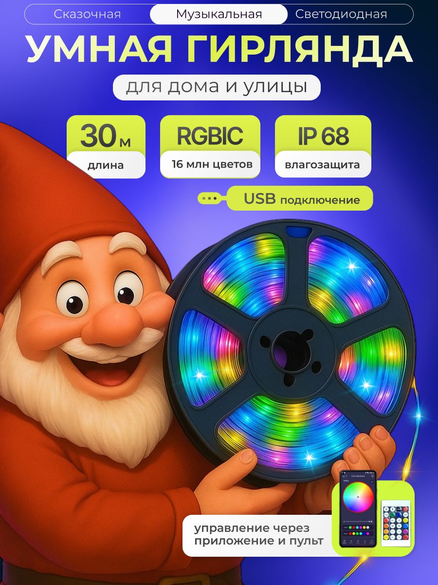 Умная гирлянда для дома и улицы RGB - IC с Bluetooth, 30м, IP68 / гирлянда RGB 30м, USB + Bluetooth + пульт ДУ – покупайте на OZON по выгодным ценам! Быстрая и бесплатная доставка, большой ассортимент, бонусы, рассрочка и кэшбэк. Распродажи, скидки и акции. Реальные отзывы покупателей. (2873712176)