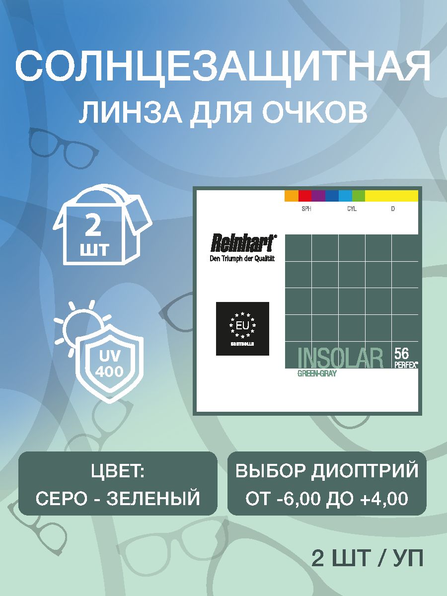 Линзыдляочковcдиоптриями+1,75солнцезащитные(окрашенные)серо-зеленыеизполимерногоматериала1,56сантибликовымпокрытиемD65мм1шт/уп