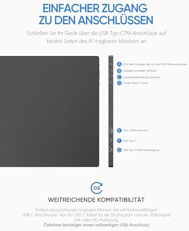 Ich bin sehr zufrieden mit dem ARZOPA 15,6" tragbaren Monitor. Bildqualität und Verarbeitung sind wirklich gut – das Full-HD-Display ist scharf, die Farben sind kräftig, und durch das schlanke Design lässt sich der Monitor bequem überall mitnehmen.Ein wichtiger Hinweis:Man sollte darauf achten, dass das verwendete USB-C-Kabel Videodaten übertragen kann. Das mitgelieferte Kabel funktioniert problemlos, aber viele USB-C-Kabel, die man vielleicht vom Handy-Laden kennt, übertragen nur Strom und sind daher nicht kompatibel. Wenn man das beachtet, ist die Einrichtung super einfach – anschließen und loslegen.Insgesamt ein sehr empfehlenswerter, mobiler Monitor mit einem guten Preis-Leistungs-Verhältnis.