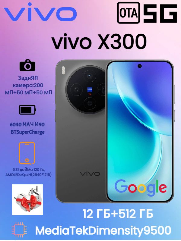 vivoСмартфонVivoСмартфонX3005G,Камера200Мп,КомпактныйФлагман,БеспроводнаяЗарядка40Вт,LTPOДисплей6.31″CN12/512ГБ,черныйматовый