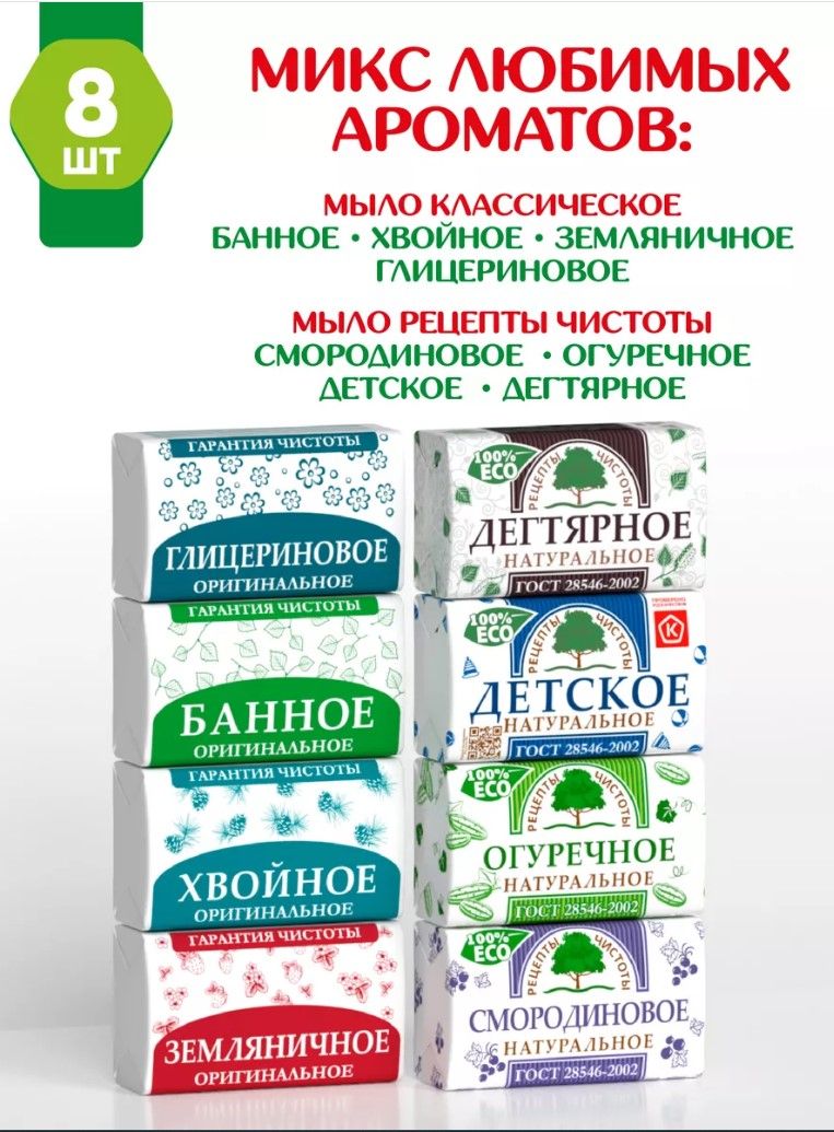 Мыло набор 8 шт по 180 г (Банное, Детское, Земляничное, Хвойное, Дегтярное, Смородиновое, Огуречное, Глицериновое), косметическое твердое кусковое – покупайте на OZON по выгодным ценам! Быстрая и бесплатная доставка, большой ассортимент, бонусы, рассрочка и кэшбэк. Распродажи, скидки и акции. Реальные отзывы покупателей. (1848970766)