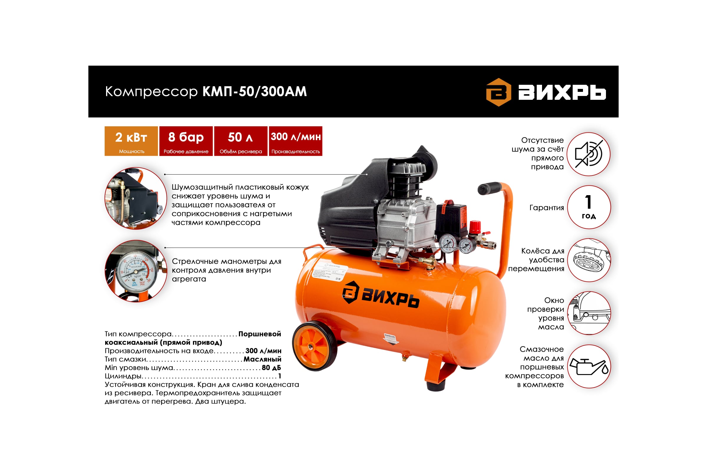 КомпрессорВихрьКМП-50/300АМпредназначендлянагнетаниясжатоговоздухавпневматическоеоборудование.Онактивноиспользуетсянастроительныхплощадках,времонтныхмастерских,напроизводстве,нашиномонтаже.Основнаяконструктивнаячастькомпрессора–ресивер.Онпозволяетнакапливатьсжатыйвоздух,охлаждатьего,собиратьобразовавшийсяконденсат.Компрессоримеетпрессостат,позволяющийемуфункционироватьврамкахнеобходимогодавлениявавтоматическомрежиме.Воздушныйфильтрпредохраняетпоршневуюгруппуотпопаданияпылиимусора.ОтличительныеособенностимоделиВихрьКМП-50/300АМ:Номинальнаямощностьустройствасоставляет2кВт.Производительность–300л/мин.Приподборекомпрессораоченьважнообращатьвниманиенаэтухарактеристику.Производительностькомпрессорадолжнабытьв1,5разабольшенеобходимой.Такустройствобудетработатьвэкономичномрежимеипрослужитдольше.Объемресиверасоставляет50л.Этопозволяетполучитьстабильнуюподачусжатоговоздуха.Низкийуровеньшума–75дБ.Термозащитаотключаетоборудованиеприперегревеивозобновляетегоработупослеохлаждения.Наножкахрасположенаантивибрационнаянасадка.Транспортировочныеколесапозволяютслегкостьюперемещатьустройство.КомпрессорВихрьКМП-50/300АМспособенобеспечитьработубольшогоколичествапневматическогооборудованиязасчетхорошихпараметров.Безнегонеобойтисьнашиномонтаже,настроительнойплощадке.