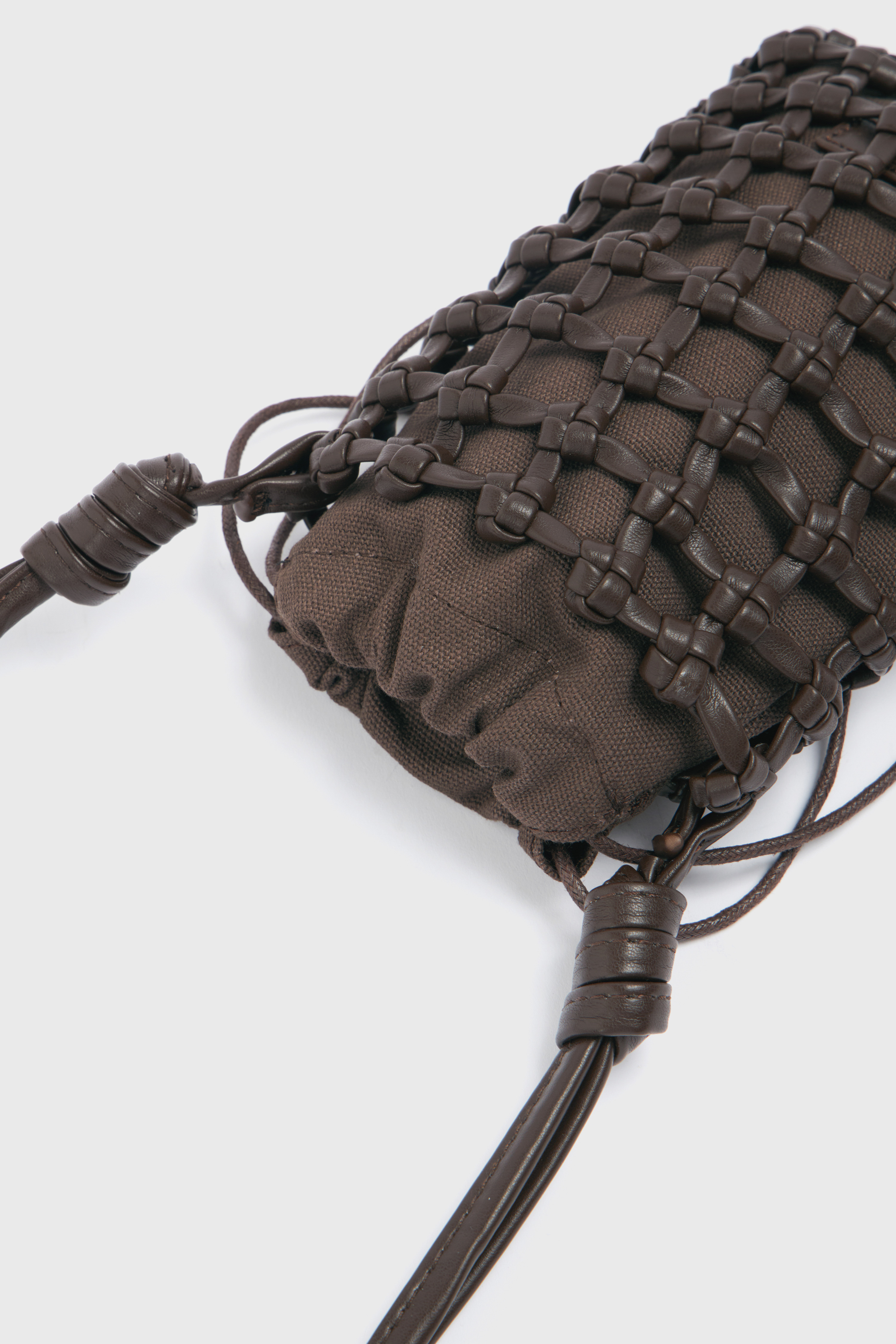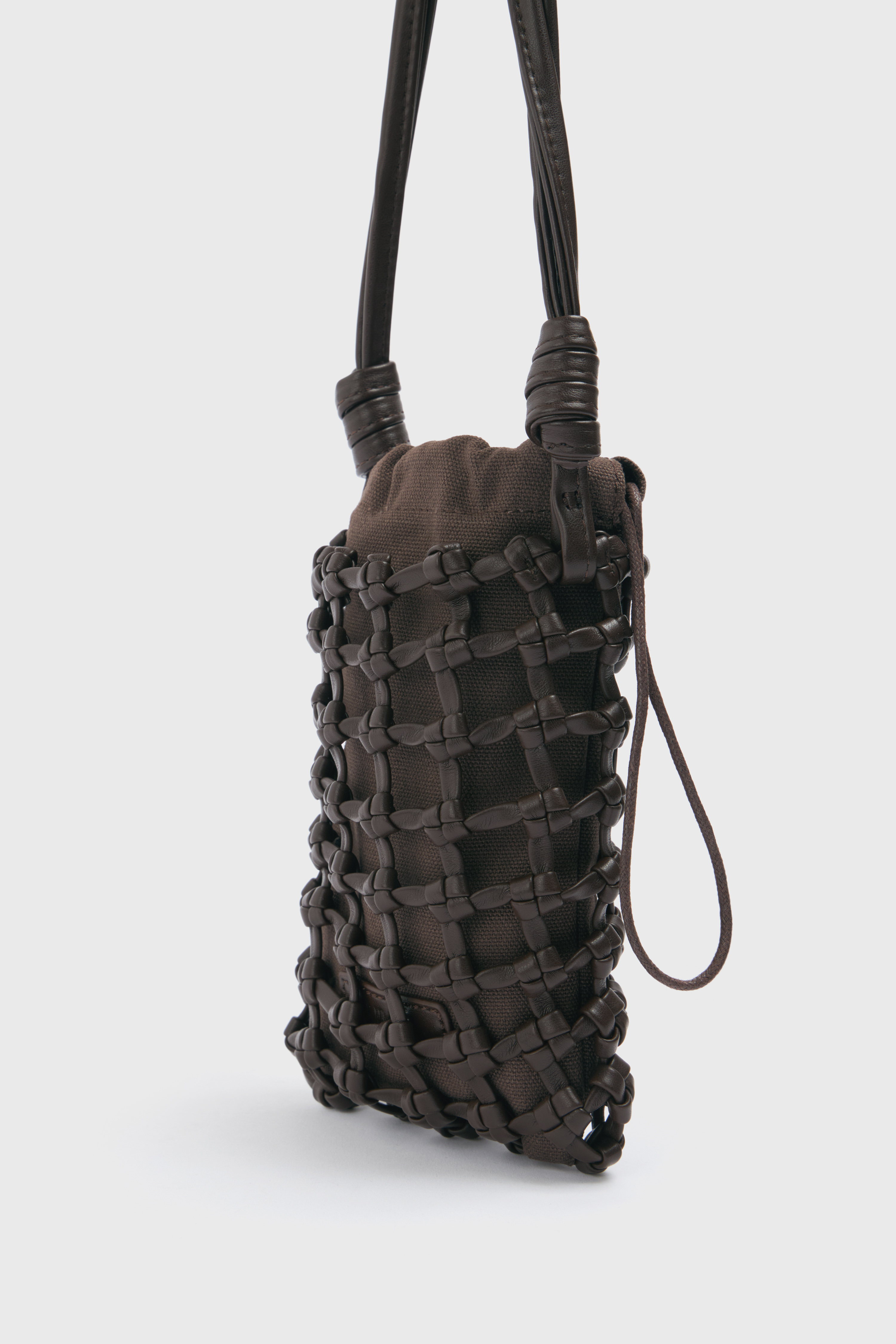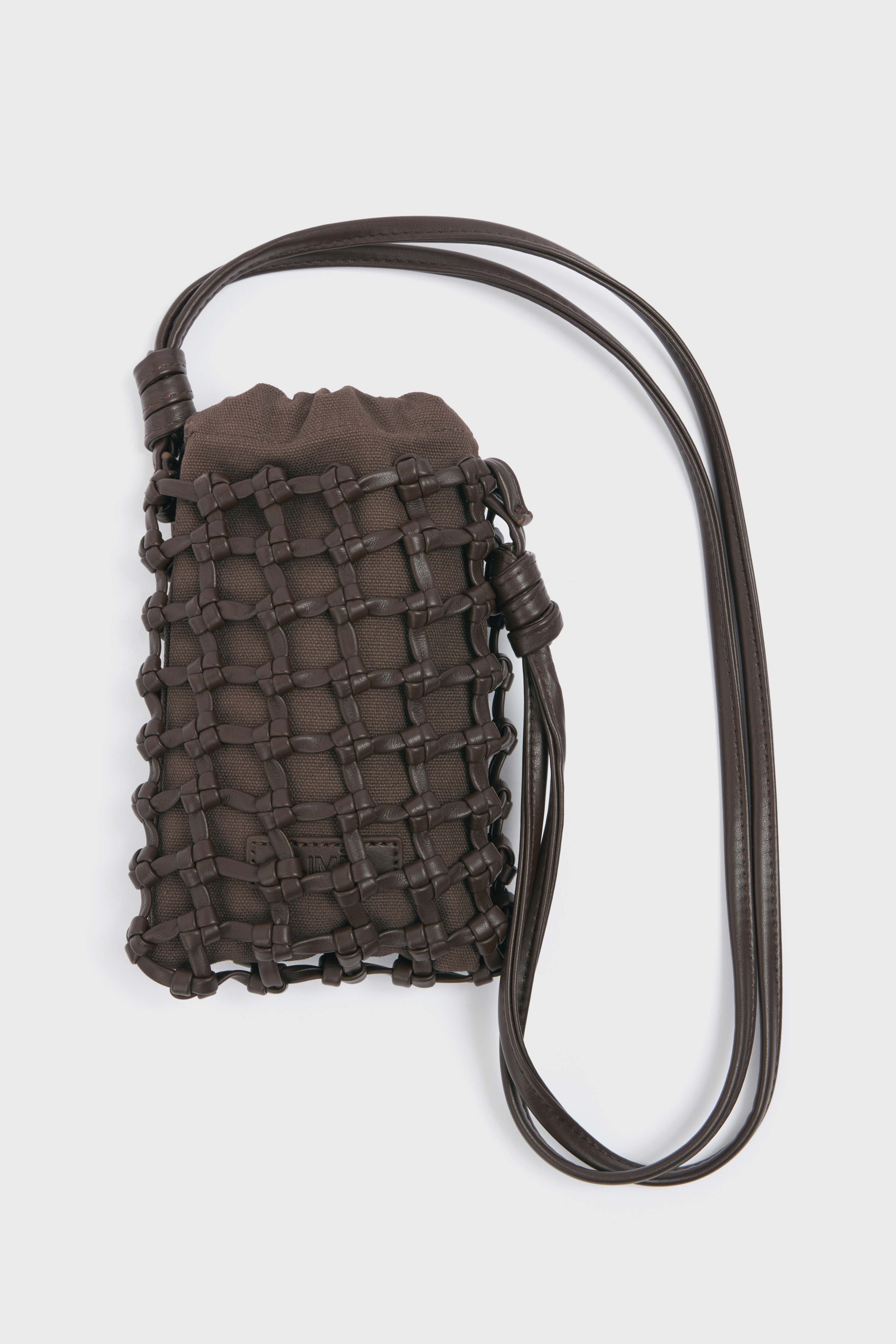 Комбинированная сумка кросс-боди LIMÉ Комбинированная сумка из искусственной кожи и фактурного канваса. Крупная сетка-чехол выполнена по технологии плетения макраме. Основное отделение с застежкой на узкие завязки. Регулируемый длинный ремень, позволяющий носить аксессуар через плечо. Размер: 11 х 2 х 21 см (длина х ширина х высота)..