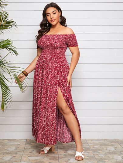To find out about the Plus Off Shoulder Shirred Split Ditsy Floral Dress at SHEIN, part of our latest Plus Size Dresses ready to shop online today!