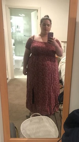 Love this dress! It makes me feel good wearing it. Mainly posting this so that ladies with a larger size like myself can see how it might look on them and not the smaller model. One of my favorite dresses!