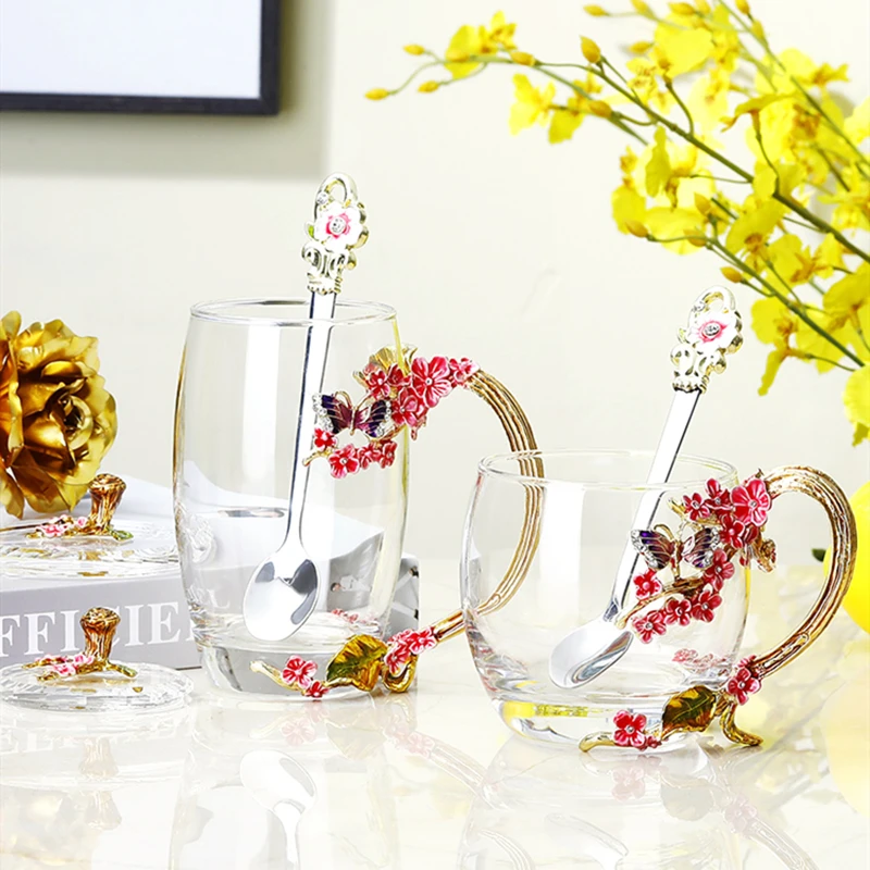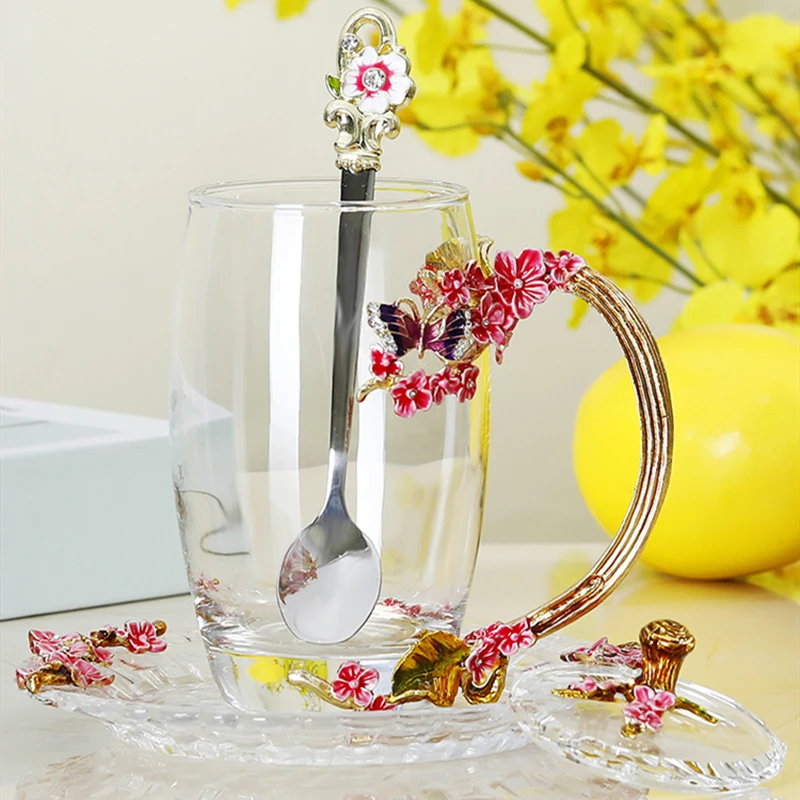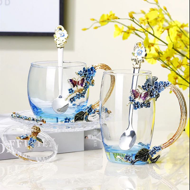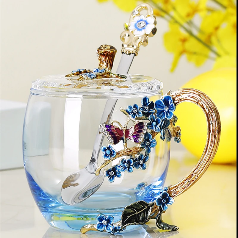 Креативные винтажные эмалированные стеклянные чашки, ручка с синими цветами сливы, рукоятка с кристаллами для воды, цветов, чая, кофе, WineGift