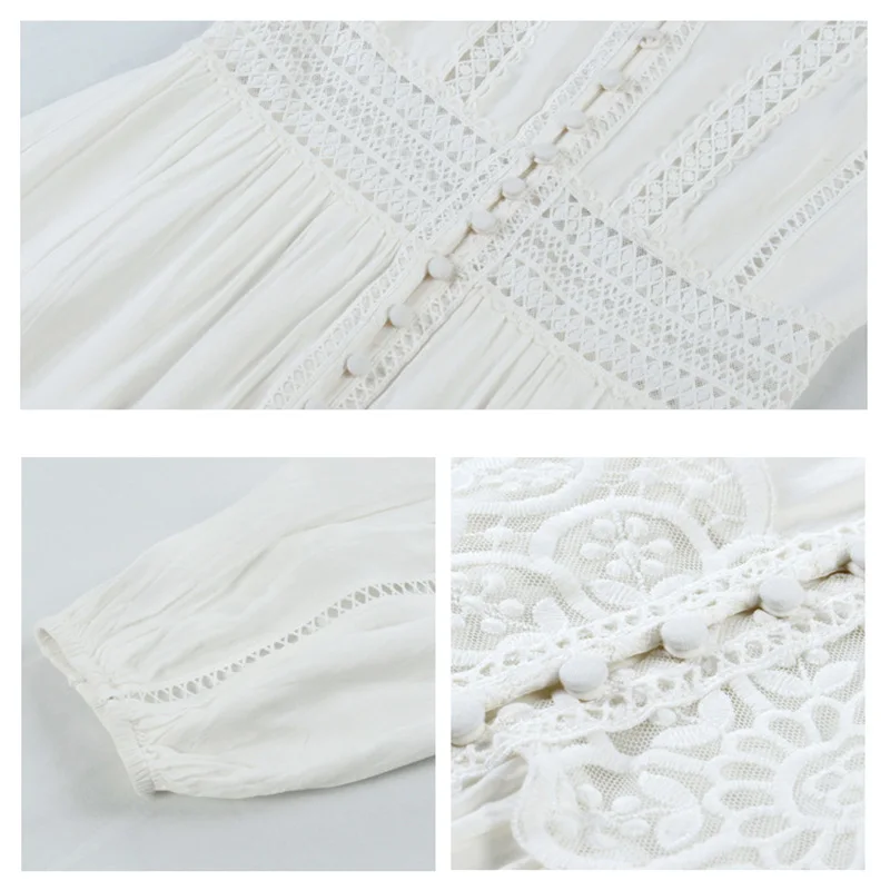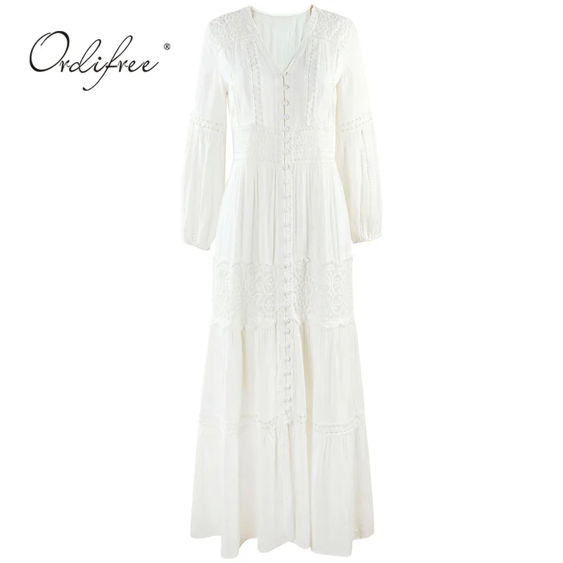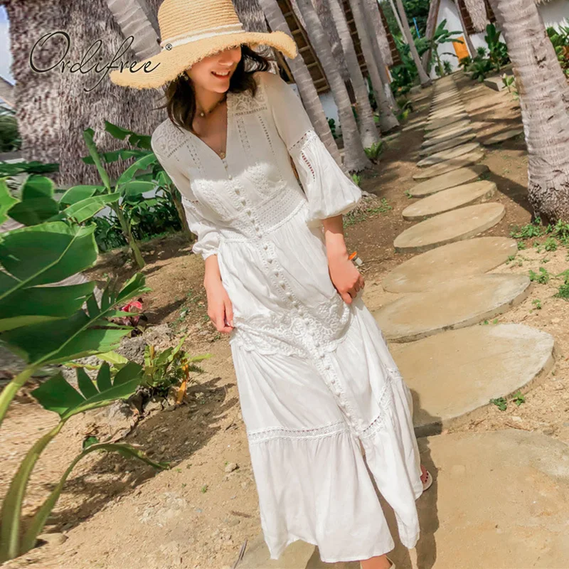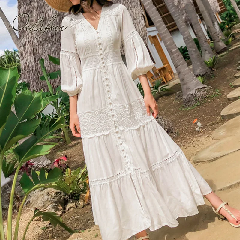 Ordifree 2021 летнее платье в стиле бохо, Для женщин Макси Вечерние платье свободного кроя, Сексуальное Белое Кружевное длинное платье туника с пляжное платье