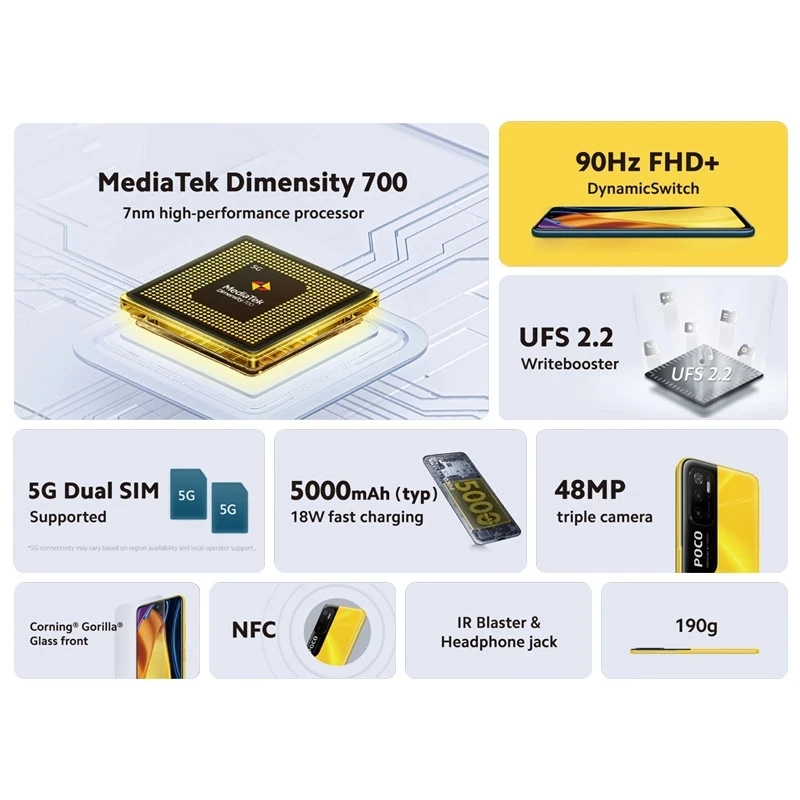Глобальная версия POCO M3 Pro 5G смартфон NFC 64 Гб/128 ГБ Dimensity 700 Octa Core 90 Гц 6,5 "FHD + безрамочный экран с Экран 48MP тройной Камера 5000 мА ч