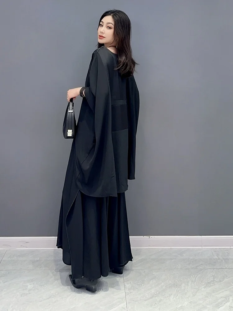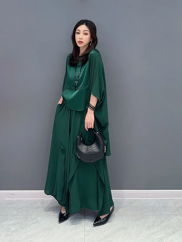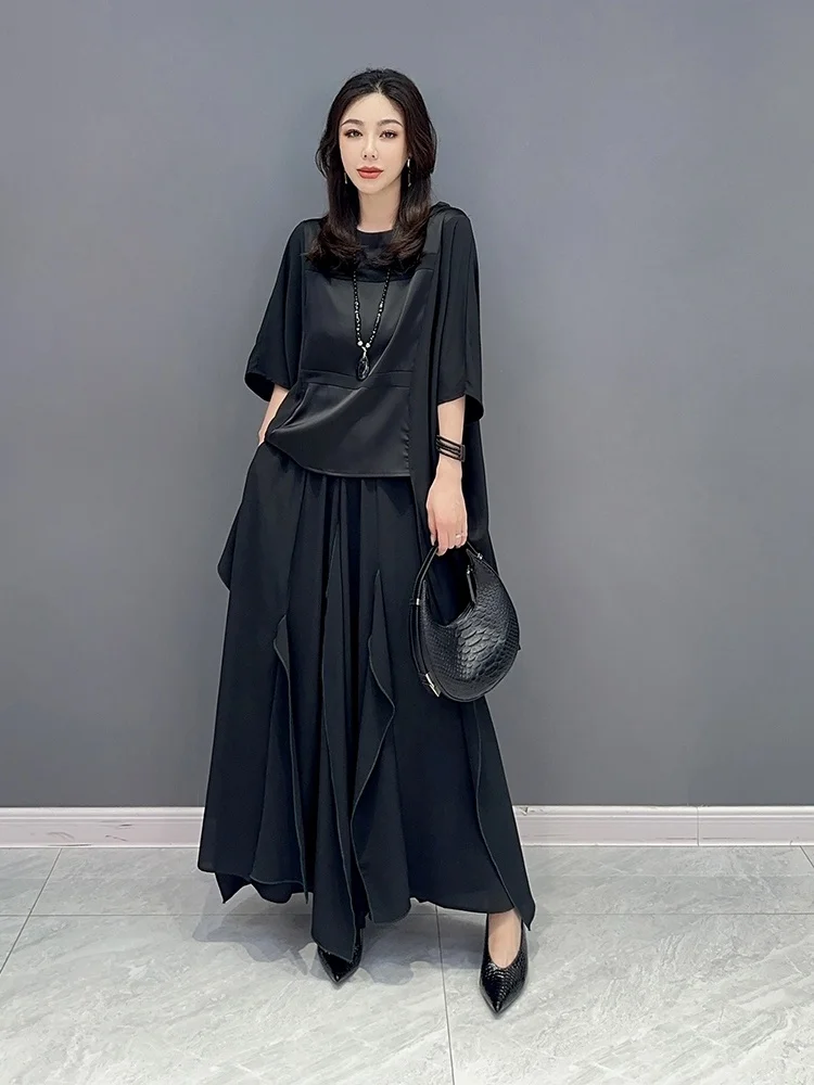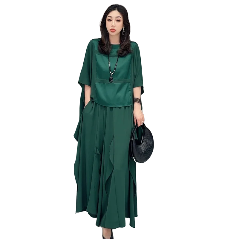Vefadisa 2023 Summer New Women Set Personalized Irregular Black Green Top Casual Wide Leg Pants Trendy Girl Two Piece Set ZY1391