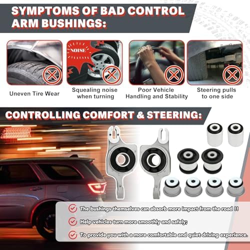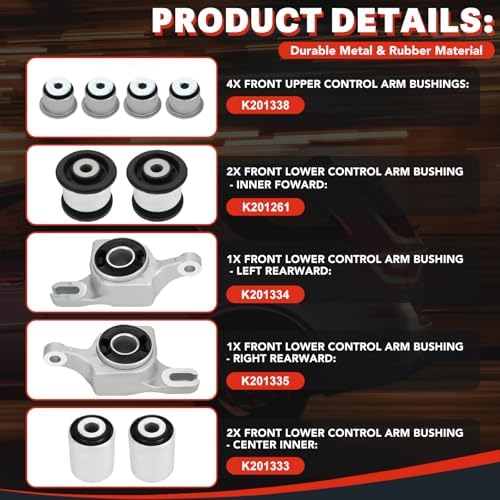 Performance: A direct replacement for your old original bushings,improve the stability of your vehicle's handling and steering response,giving you comfortable driving experience. Application: This 10pcs Front Control Arm Bushing Kit is compatible with Jeep Grand Cherokee 2011-2015, compatible with Dodge Durango 2011-2015. Installation Position: Left, Right, Front, Upper, Lower. Material: The PQY control arm bushing kit is consisted of silver aluminum bracket and black rubber bushings. Replacement Part Numbers: 68022624AE, 05168158AA, 05168158AB, 05168159AA, 05168159AB, 5168158AA, 5168158AB, 5168159AA, 5168159AB, 68022600AD, 68022601AD, 68022614AA, K201334, ZY68069861, K201335, ZY68069862, 68022613AR, K201261, K201333 Kit Contents: 4x Control Arm Bushing (K201338), 2x Control Arm Bushing (K201261), 2x Control Arm Bushing (K201333), 1x Control Arm Bushing (K201334), 1x Control Arm Bushin (K201335)