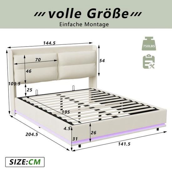 Litcoffre140x190,Lit140x190avecrangementetsommier,lumièreLEDréglableetUSB,Dossieramovibledoux,velours,beige