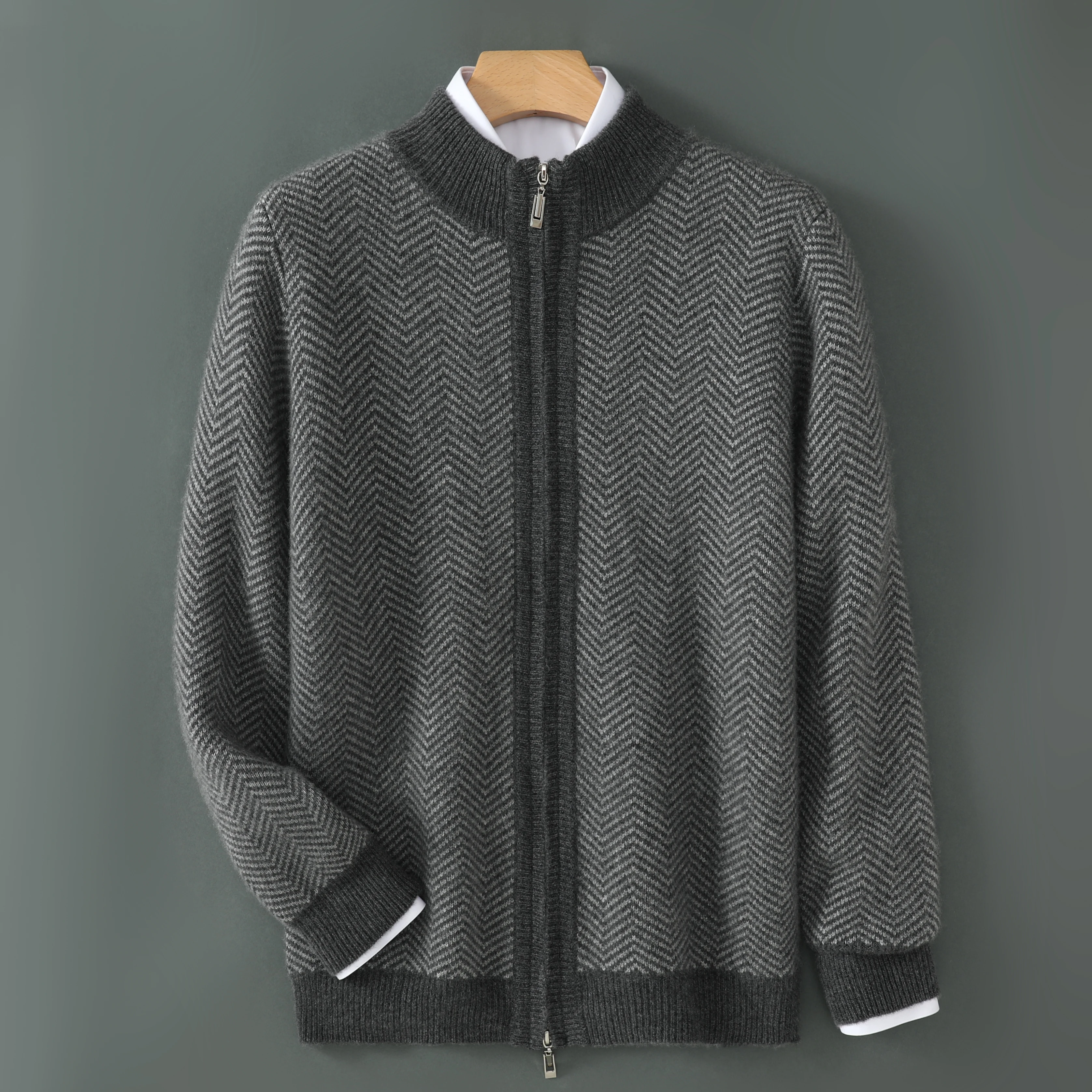 Embrace cozy style with our 2024 Men's Thick Cashmere Cardigan, featuring a half high collar and color zipper for a modern twist on classic knitwear.