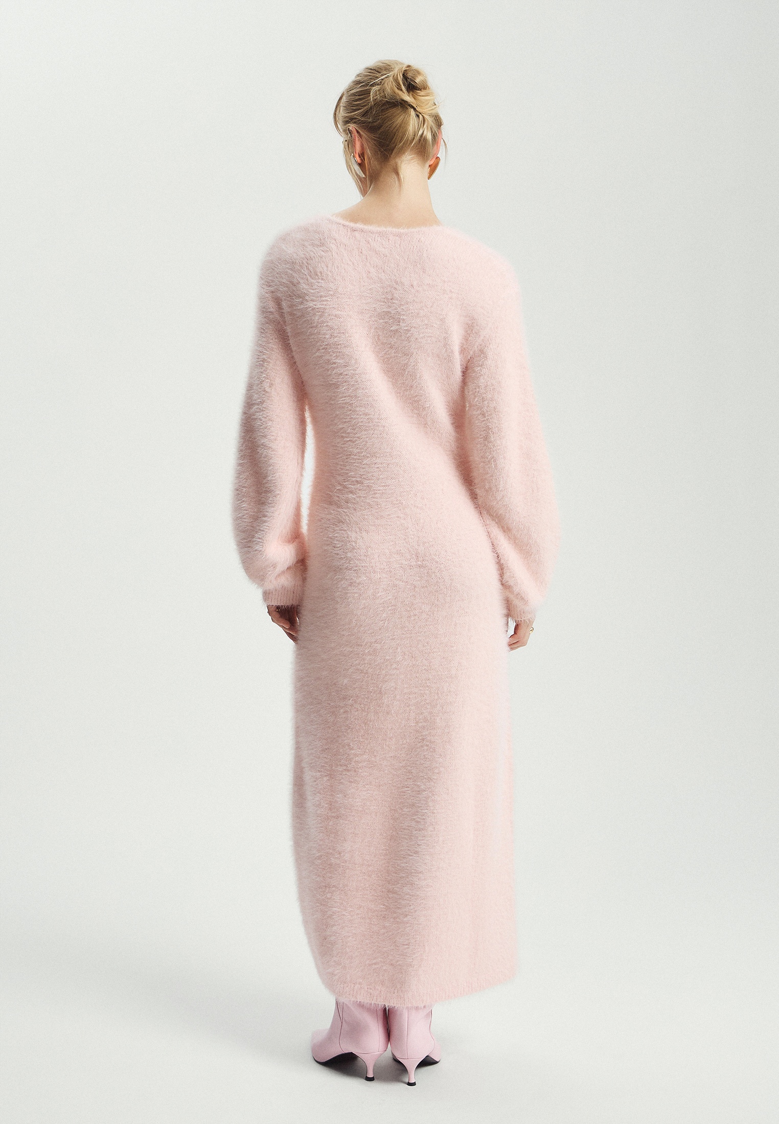 Вязаноеплатьевыполненоизпушистоготрикотажа.Модельсвободногокроя.Детали:длинамиди,О-образныефигурныерукава,расклешеннаяюбка