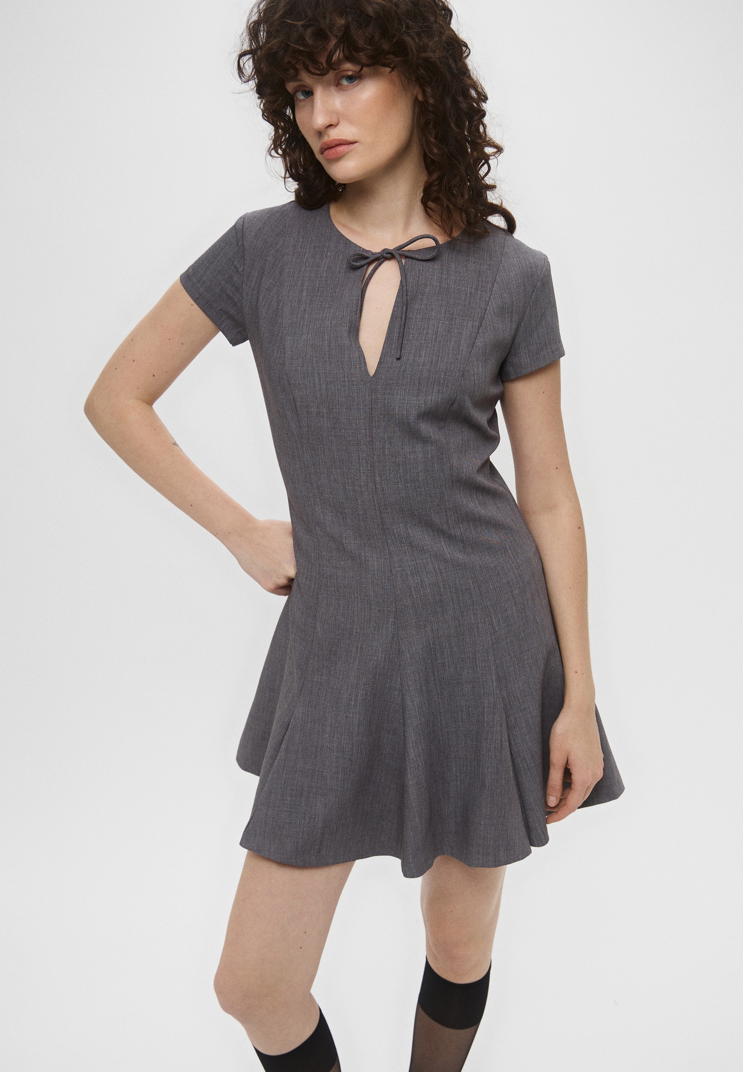 Платьеминиизэластичнойтканисрасклешеннымподолом.Приталенныйкройсподчеркнутымишвами.Вырезнатонкихзавязках.Модельнаподкладкезастегиваетсямолниейнаспине.