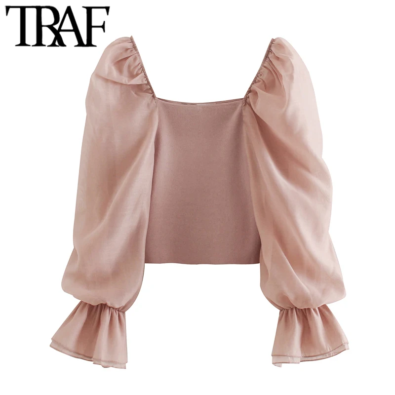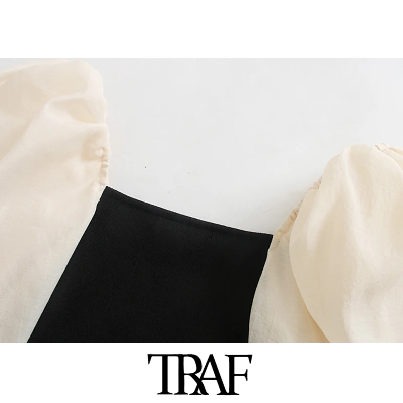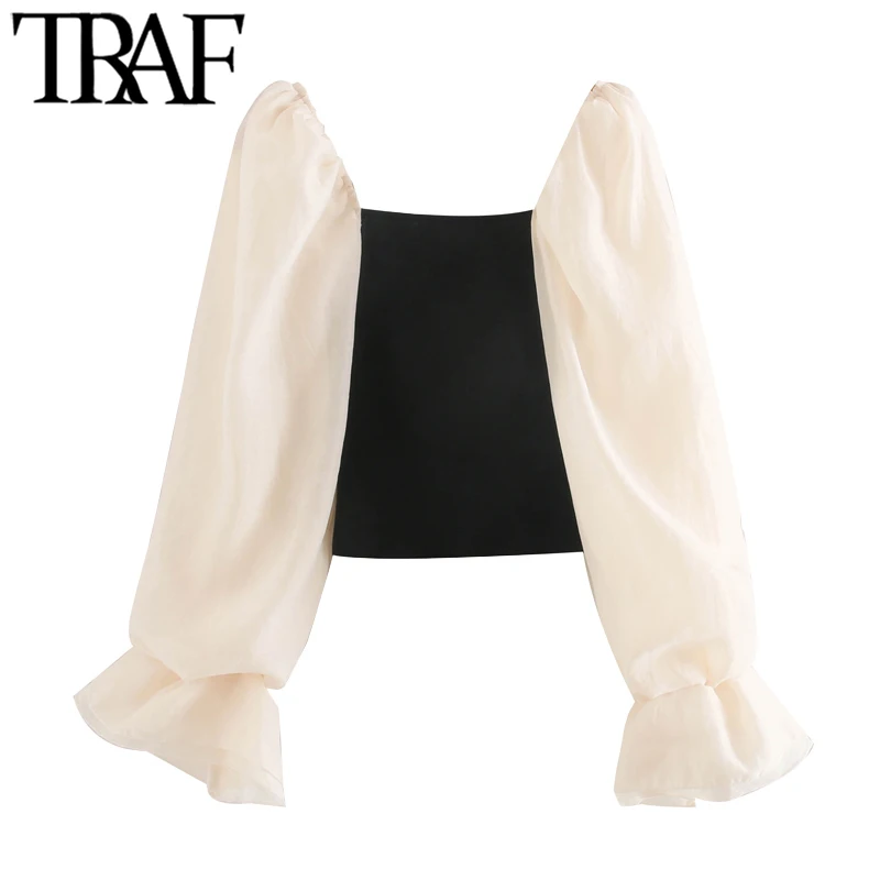 TRAF Женская мода Лоскутная органза Обрезанные трикотажные блузки винтажные прозрачные рукава стрейч женские рубашки шикарные топы