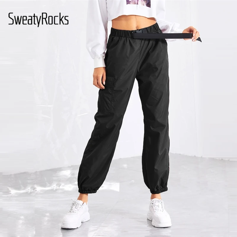 1004.97 руб. 40% СКИДКА|SweatyRocks черные повседневные брюки с карманами и завязками на талии с эластичной резинкой на талии зауженные брюки 2018 осенние женские леггинсы с цветочным принтом купить на AliExpress