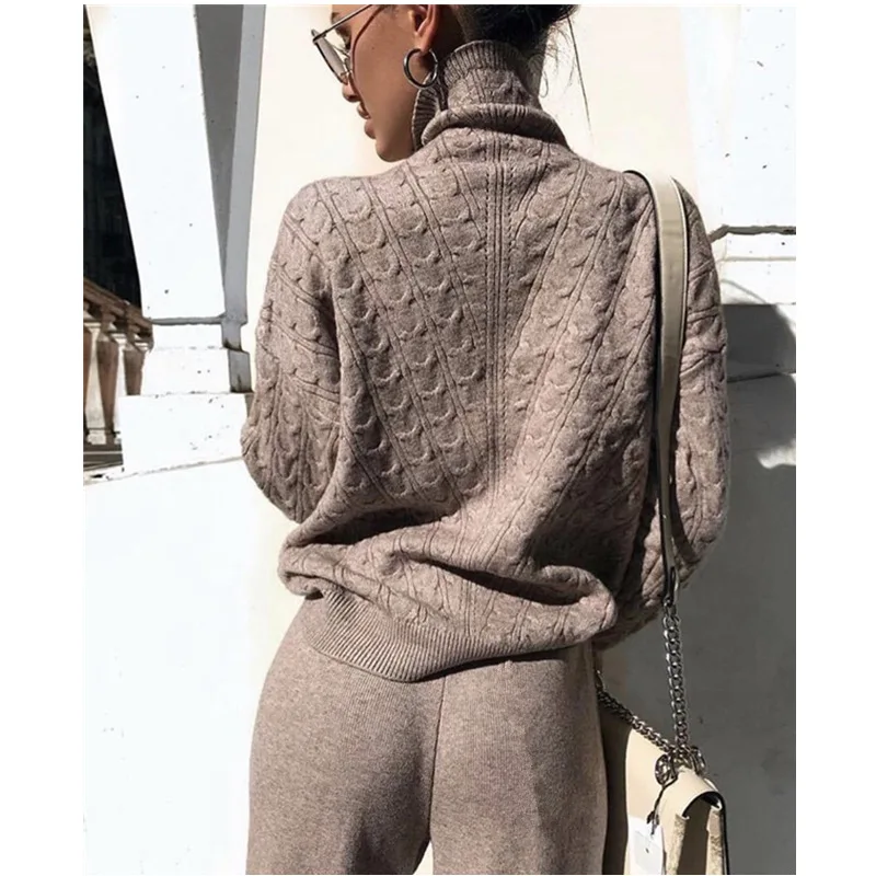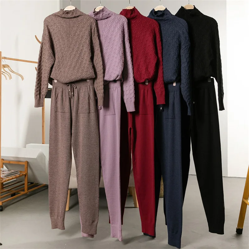Осенне зимний трикотажный спортивный костюм с высоким воротом для женщин, повседневные трикотажные брюки + свитер с высоким воротником, женский костюм, теплые женские треки|Спортивные костюмы| | АлиЭкспресс