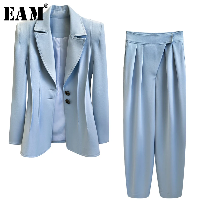 [EAM] широкие брюки, плиссированный костюм из двух предметов, новый отворот, длинный рукав, черный, свободный крой, женская мода, весна-осень 2020...