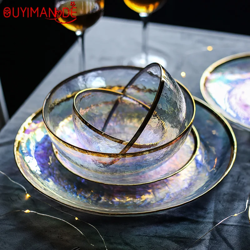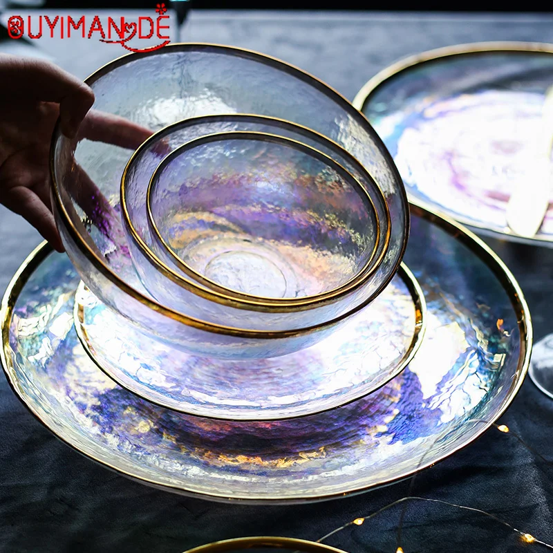 Ослепляющая цветная окрашенная Золотая Стеклянная Чаша Блюдо семь цветов Прозрачный молоток стеклянная тарелка Салатница фруктовая чаша ...