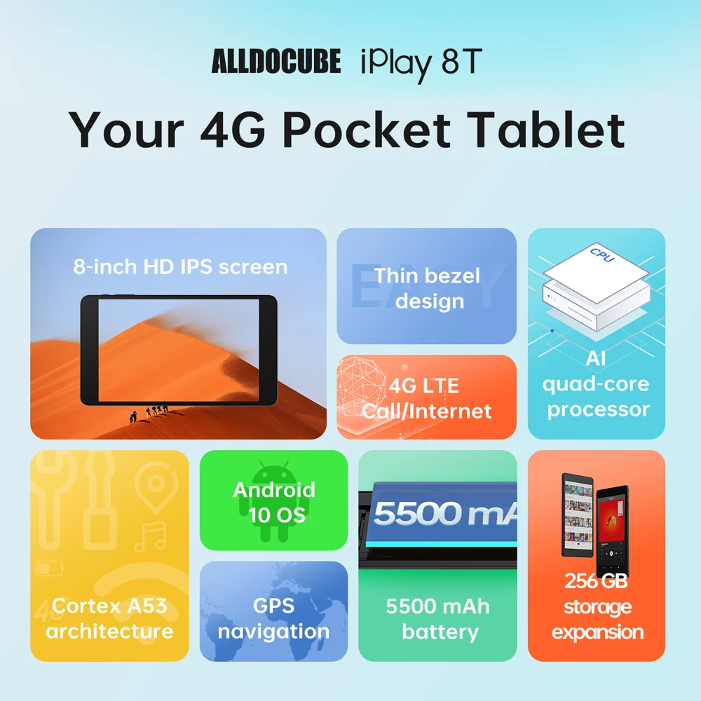 ALLDOCUBE iPlay 8T Tablet 8 pulgadas 3GB RAM 32GB ROM Android 10,0 Tablet PC 4G WIFI LTE 9832E llamadas de teléfono tabletas 1280 × 800 IPS,Consigue increíbles descuentos en artículos de vendedores chinos y de todo el mundo. ¡Disfruta de envíos gratis, ofertas por tiempo limitado, devoluciones sencillas y protección al comprador!\nDisfruta de las siguientes ventajas: ✓ Envío gratuito a todo el mundo ✓ Oferta disponible durante un tiempo limitado ✓ Devolución sencilla\n