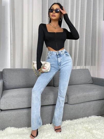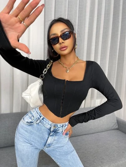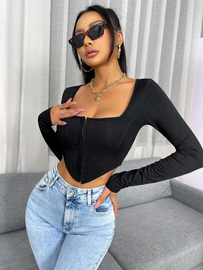To find out about the Hook And Eye Asymmetrical Hem Crop Tee at SHEIN, part of our latest Women T-Shirts ready to shop online today!
