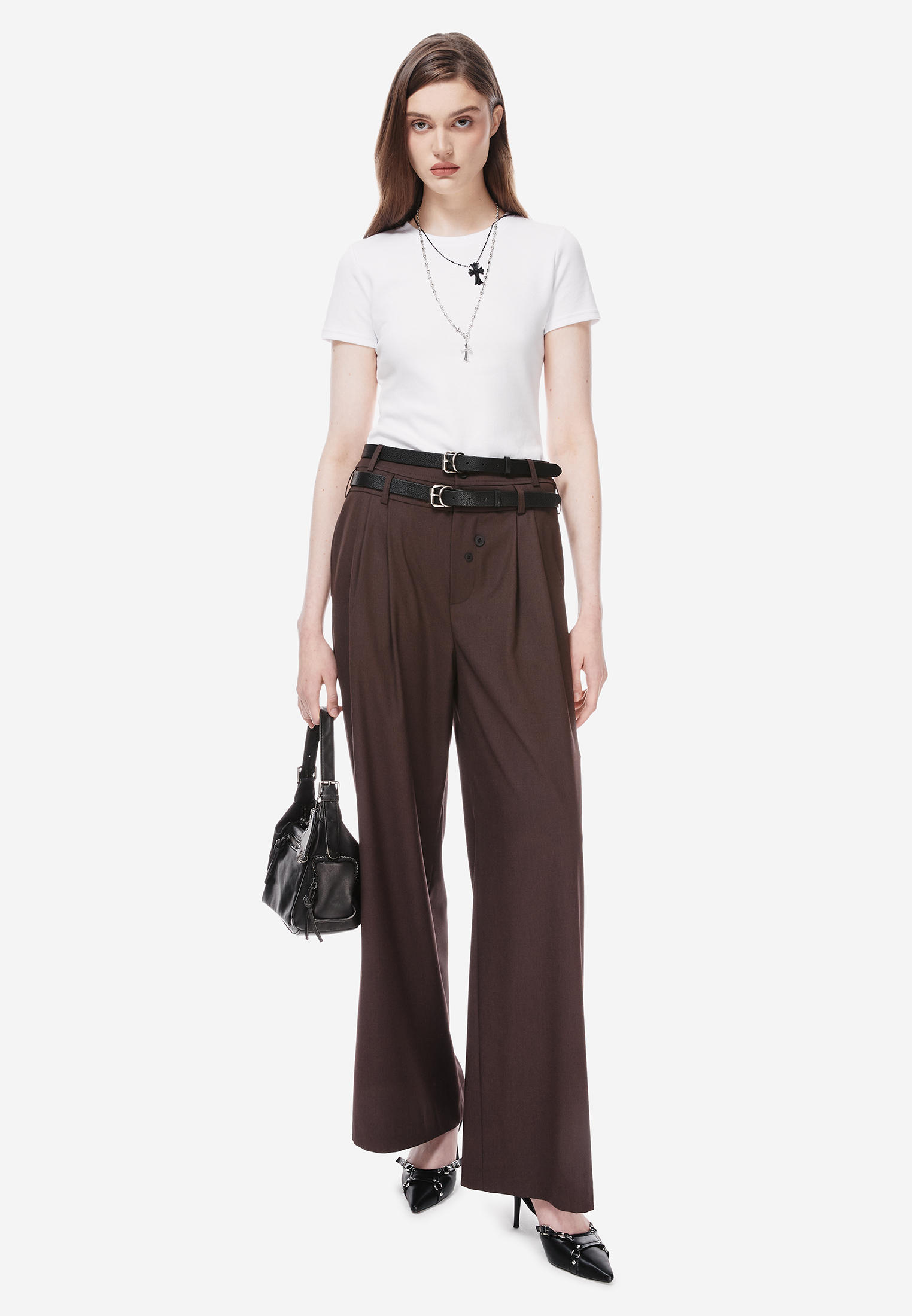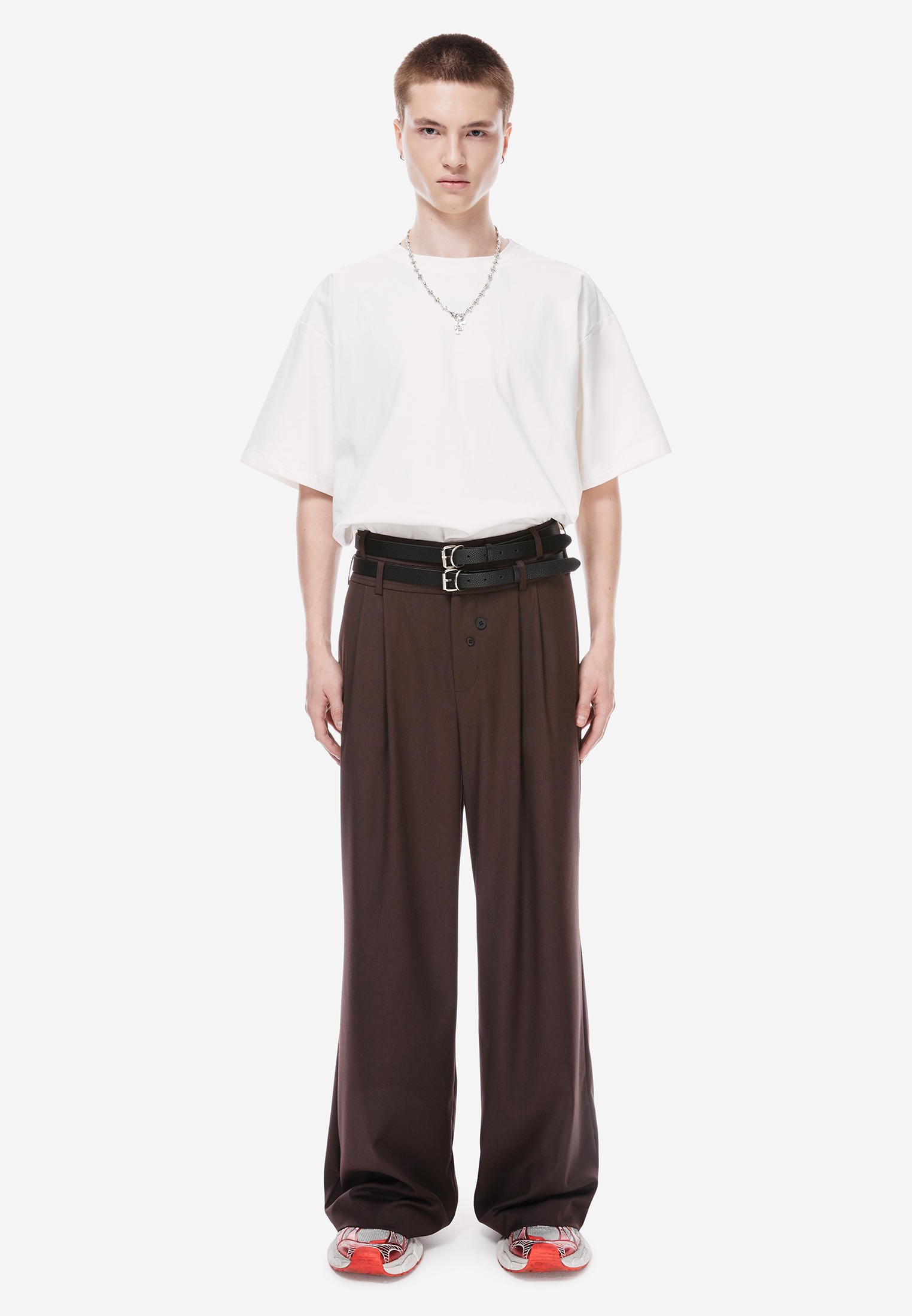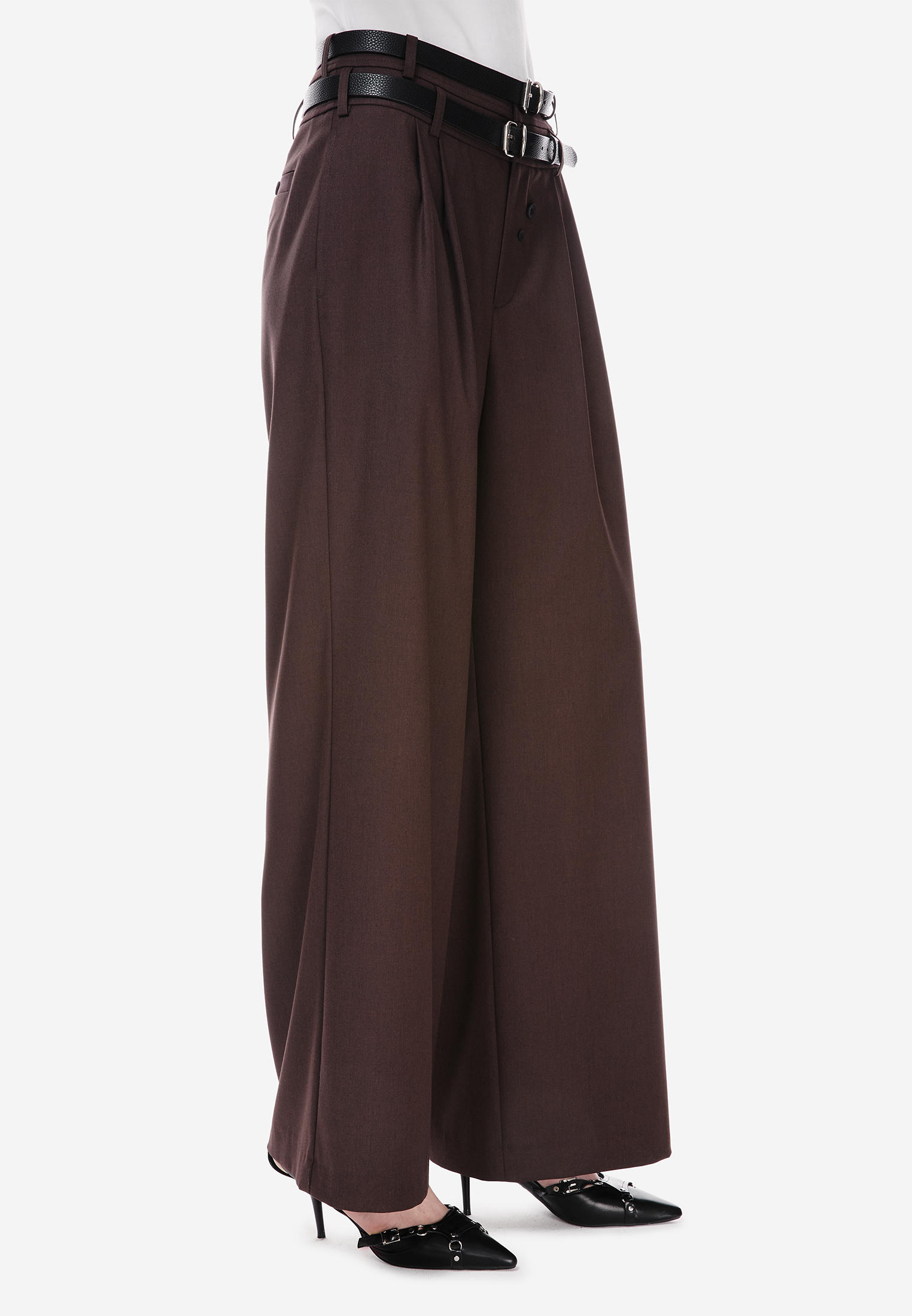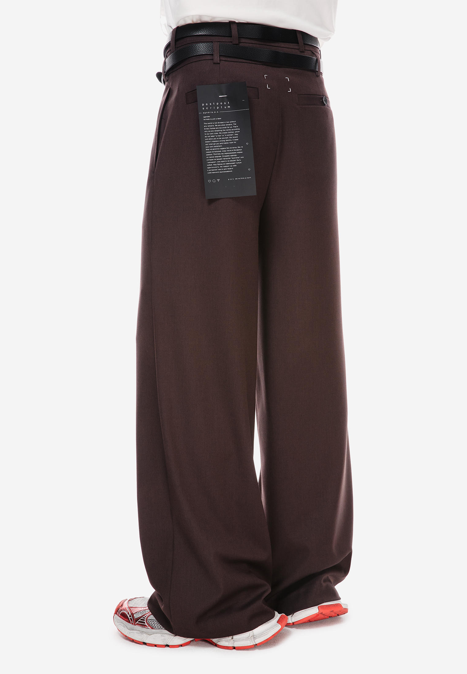 Дляпошиваширокихбрюкпрямогосилуэтаиспользовалиплотнуюкостюмнуюткань.Оригинальностьизделиюпридаетдвойнойпояссдвойнымнаборомшлевоксразудлядвухремней.Защипынаштанинах,прорезныекарманыпобокамикарманыспуговицамисзади.модельзастегиваетсянапуговицы.