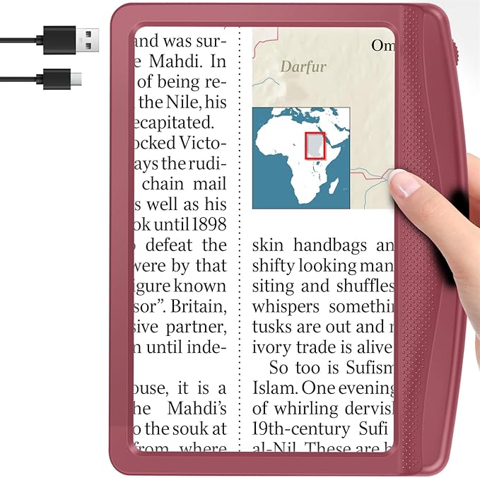 Are you still frustrated by slipping battery covers on other products, try our upgraded rechargeable model for a better experience. USB Rechargeable Design: Say goodbye to constant battery replacements! Our page magnifying glass with light comes with a convenient USB charging design, offering up to 12 hours of continuous use on a full 2-hour charge. No more dealing with slipping battery covers or frequent changes—just charge and go! 5X Lightweight Full Page Magnifier: The magnifier features high-quality, distortion-free, Fresnel optical lenses with a magnification of up to 500%, ensuring clear and detailed reading while minimizing distortion. Large Viewing Area for Effortless Reading: The oversized 7x4.5 inch rectangular lens covers large sections of text, reducing the need for constant repositioning. This ergonomic magnifier is perfect for reading books, newspapers, and documents, or viewing detailed images, all while keeping your hands comfortable even during extended use. Bright LED Illumination with Adjustable Brightness: Equipped with 20 ultra-bright LED lights, this handheld magnifier ensures even lighting across your reading area, reducing eye strain and providing clear, crisp visibility. The easy-to-use dimmer switch lets you customize the brightness to suit any environment, giving you the perfect amount of light for reading, crafting, or detailed work.